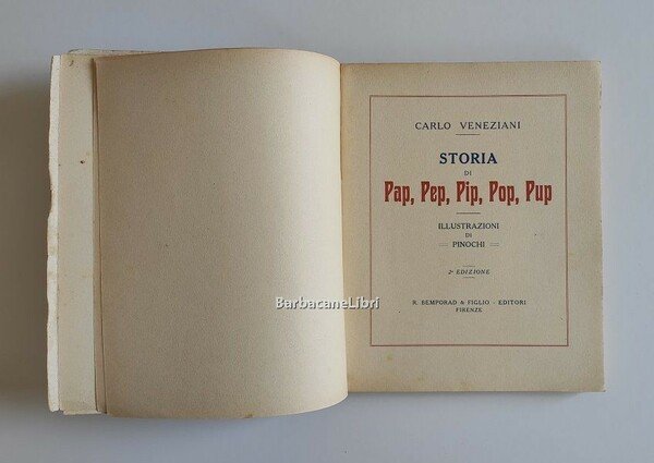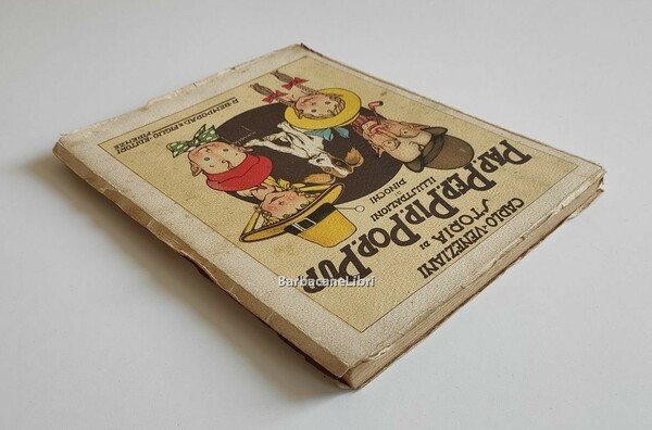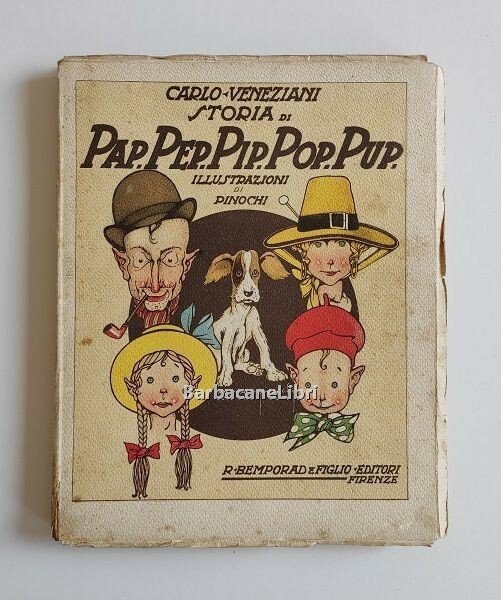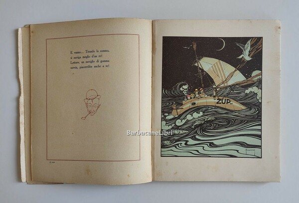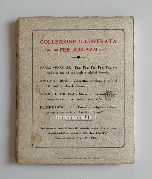 Libro d'epoca per bambini con testo del commediografo e giornalista Carlo Veneziani (1882-1950) e splendide illustrazioni a colori di Enrico Mario Pinochi (1900-1965), celebre illustratore, grafico e fumettista.