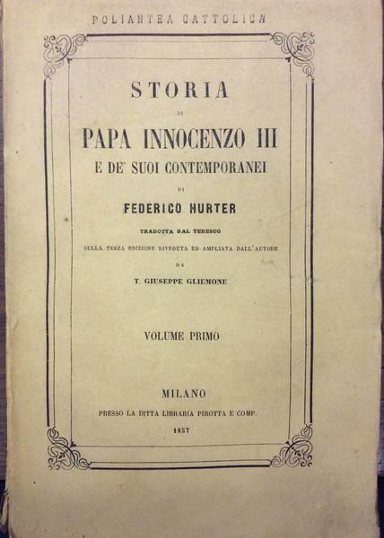 STORIA DI PAPA INNOCENZO III E DE' SUOI CONTEMPORANEI. - Tradotta dal tedesco sulla terza edizione riveduta ed ampliata dall'Autore da Giuseppe Gliemone.