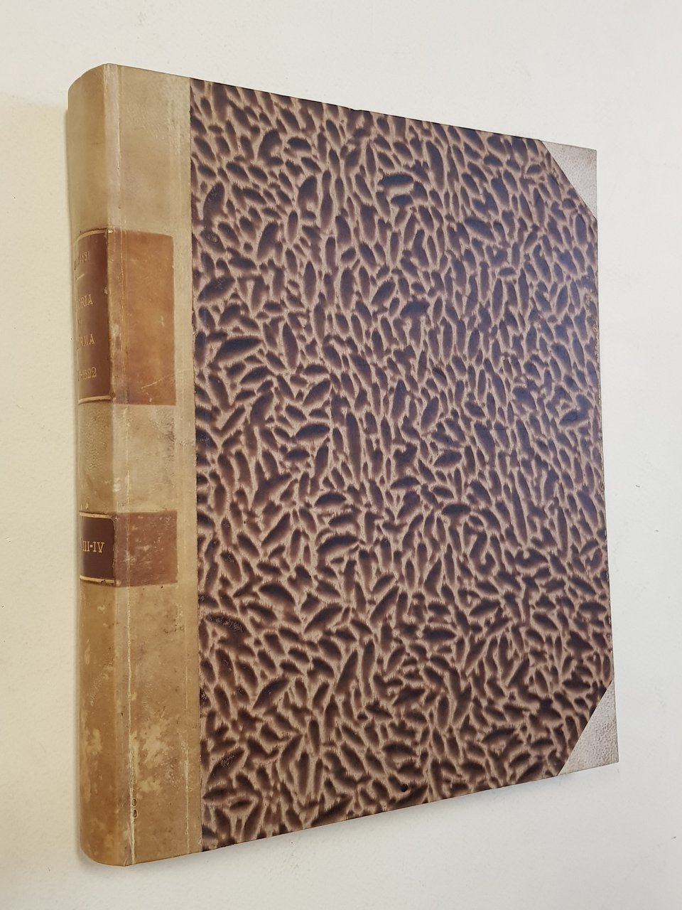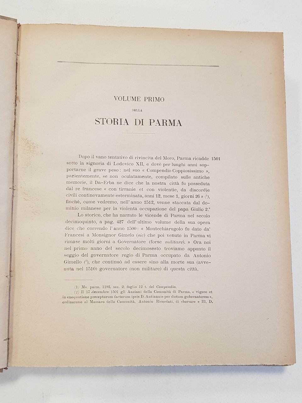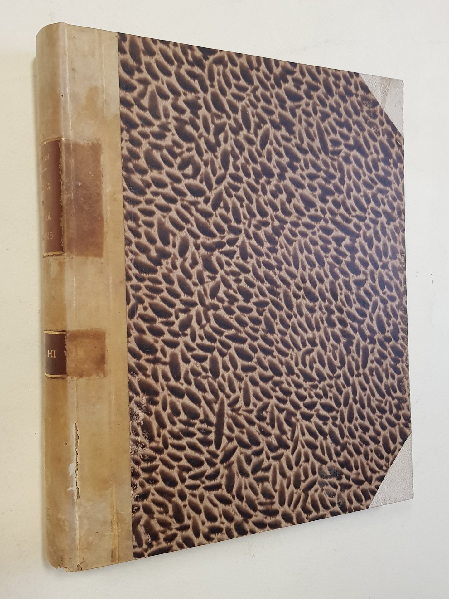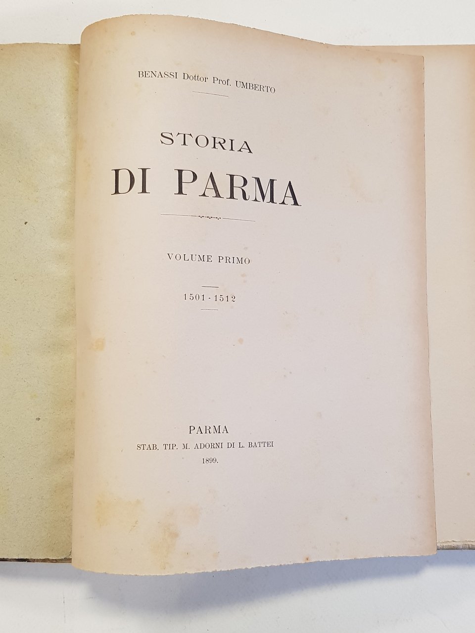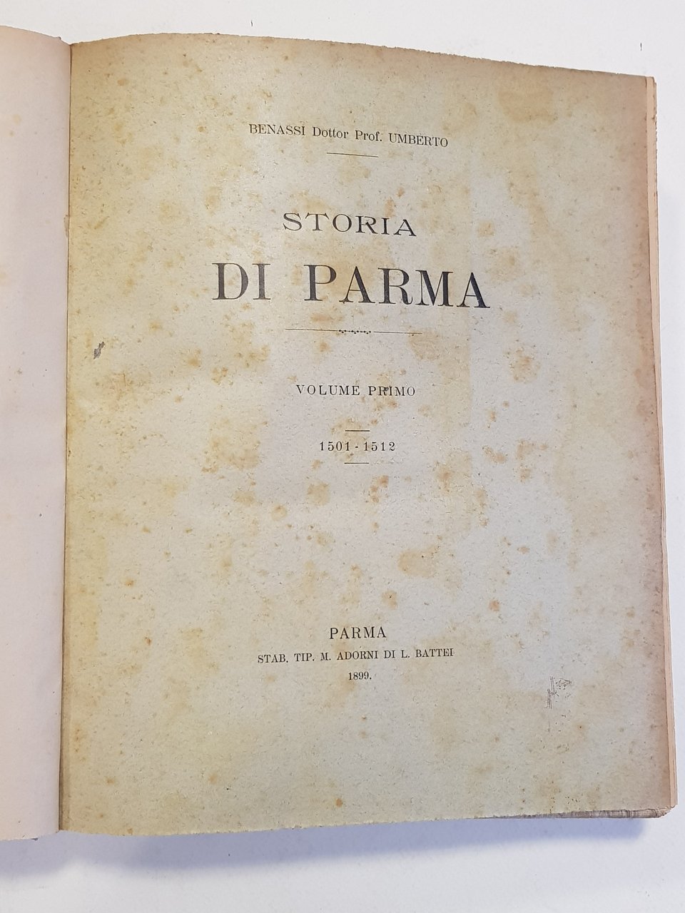 5 voll, in 3 tomi di cm. 26 x 23; pp. 296 (2) ; VIII, 345 (erroneamente ripetute due volte le pp. 305-345); 408, 148; 401; legatura artigianale in mezza pergamena con angoli e cartonato marmorizzato; tassello al dorso (conservate le brossure originali); taglio con disegno rifinito a lima.<BR>CONDIZIONI MOLTO BUONE di conservazione: lievissime abrasioni alle copertine, in particolare al tomo I; lieve menda al dorso del tomo III; pagine uniforme ingiallitura delle pagine, in particolare ai margini, dovuta alla qualità della carta; alcune sporadiche fioriture che vanno però a concentrarsi particolarmente alle brossure originali e alle pagine ad esse vicine, anch'esse dovute alla qualità della carta; pochi fori di tarlo ai dorsi; piccola menda al dorso del tomo I.<BR>Vol. I. Stab. Tip. M. Adorni di L. Battei,1899<BR>Vol. II. Tipografia Sociale Operaia, 1899<BR>Vol. III Tipografia Sociale Operaia, 1899<BR>Vol. IV, Tipografia Luigi Battei, 1899<BR>Vol. V. Tipografia Operaia Adorni Ugolotti, 1906