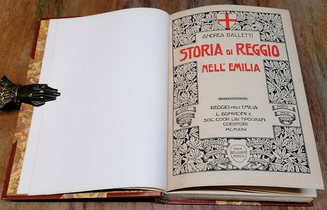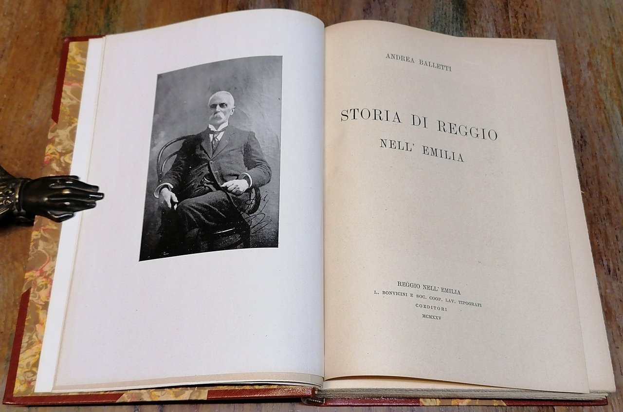 (Storia locale; Emilia Romagna; Reggio Emilia) In 8°, legatura in mezza pelle con punte, dorso a 5 nervi con titoli impressi in oro, carta marmorizzata ai piatti ed alle guardie, taglio di testa dorato, conservate le copertine della brossura editoriale, pp. XXI,(1),732,(2), con ritratto fotografico dell'autore in antiporta e numerose illustrazioni nel testo. Volume in ottimo stato di conservazione, parzialmente intonso. Edizione originale.