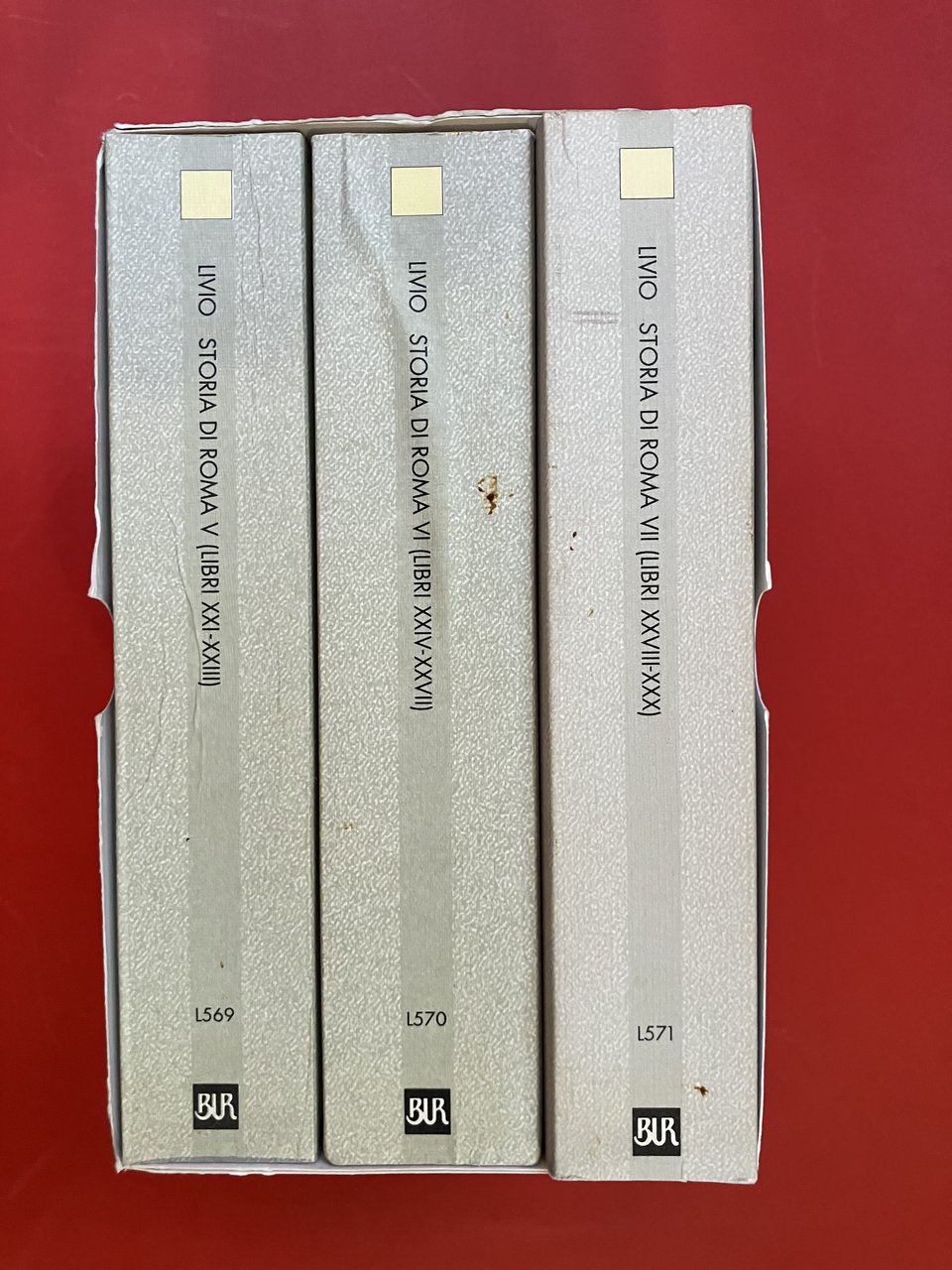 Rizzoli 2001, VIII ed., BUR classici latini e greci 569-571, tre volumi in brossura in cofanetto ill., pp. 582+724+656, volume V Libri XXI-XXIII, volume VI Libri XXIV-XXVII, volume VII Libri XXVIII-XXX, testo latino a fronte, trad. di Bianca Ceva, note di Mario Scandola, 88-17-16569-7, 88-17-16570-0, 88-17-16571-9. Il volumi sono in condizioni più che buone.