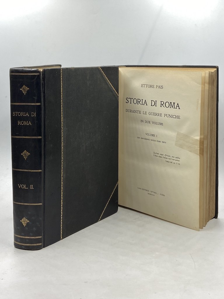 Due volumi in legatura pressoché coeva in mezza pelle con angoli e titoli dorati sul dorso, cm 25x17, pp XVI 419 (1), 483 (1); CXII tavole nel primo volume, CXL anche ripiegate nel secondo. Corposo studio di Ettore Pais (Borgo San Dalmazzo 1856 - Roma 1939), seguito dei cinque volumi già pubblicati sulla Storia di Roma dalle origini alle guerre puniche.
