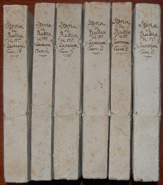 In (20,2x13,5 cm); 6 tomi: 369, (3) pp., 319, (1) pp., 372 pp., 370, (2) pp., 296 [i. e. 304], 366, (2) pp. Legature coeve editoriali in cartoncino editoriale molle, titolo manoscritto da mano coeva al dorso. Un leggerissimo alone al margine basso bianco delle ultime 7 carte del primo volume, ininfluente e nel complesso esemplare in ottime condizioni di conservazione ad ampi margini ed ancora in barbe. Alla prima carta bianca del primo volume antica nota di possesso privata datata 1800 "Di me Niccolé Co: Batti:ala del Co: Niccolè" Prima assai rara edizione italiana, ancor più rara a trovarsi completa di tutti i volumi ed in queste ottime condizioni di conservazione, di una delle più celebri storia della Russia scritte nel settecento. La prima edizione accoluta uscì in Francia nel 1782. Pierre-Charles Levesque (1736-1812) compilò l'opera in numerosi anni basandosi su un imponente apparato documentale rintracciato negli archivi pietroburghesi dove risedette per più di 7 anni chiamato da Caterina II su segnalazione diretta di Diderot per tenere una cattedra Universitaria prima e nella Scuola Cadetti poi. L'opera ebbe subito grande successo ed ebbe grande importanza per far conoscere alle corti dell'Europa occidentale la realtà russa ed il grande potenziale del paese. Ancora oggi questa storia è considerata di grande valore ed attendibilità tanto da venir ancora ristampata. Proprio sulla scorta degli insegnamenti di Diderot e degli enciclopedisti Levesque non si accontenta di citare una fonte ma ne analizza l'attendibilità rintracciando ogni volta la fonte primaria. Opera rarissima.