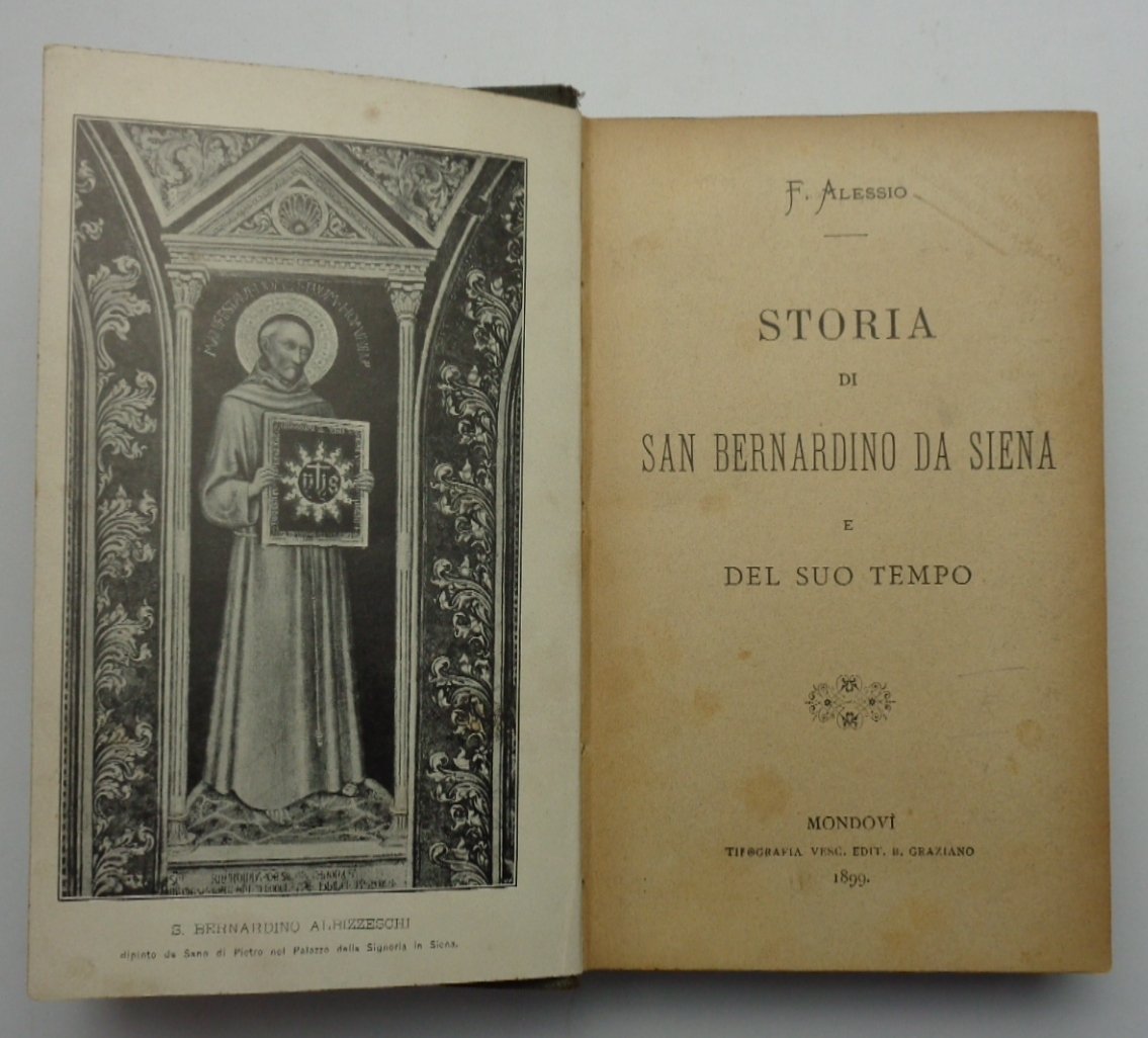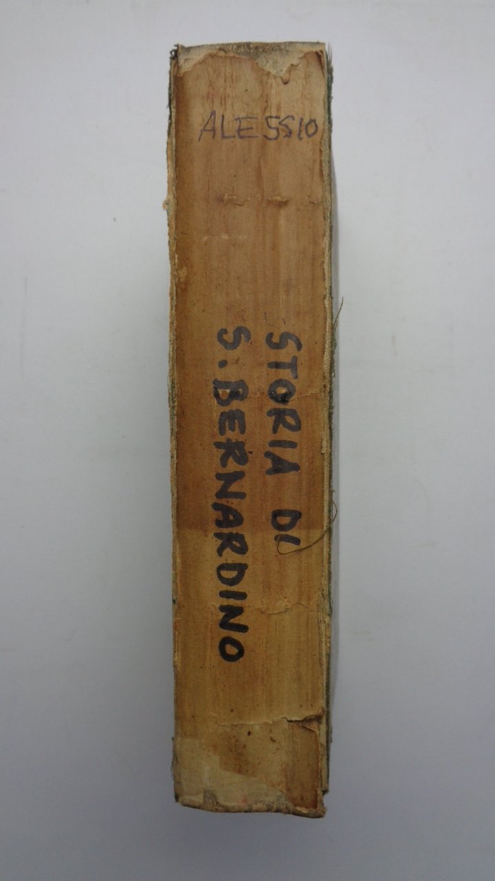 Un volume (20 cm) di 491 pagine; ritratto di San Bernardino in antiporta. Il volume porta al retro del piatto l'ex libris di p. Vittorino Facchinetti: le varie sottolineature a matita presenti nel libro sono a lui attribuibili. Bollo di biblioteca ecclesiastica estinta alla pagina bianca. Legatura coeva, cui MANCA del tutto il dorso, con altre usure. Al retro del piatto, come indicato, l'ex libris di p. Vittorino Facchinetti (1883-1950). "Antesignano dei mezzi audiovisivi applicati all'apostolato, predicò in Italia e all'estero, scrisse numerose opere e una trilogia delle vite di San Francesco, Sant'Antonio, San Bernardino. Fu il primo oratore sacro ai microfoni della radio divenendo subito popolare e ascoltatissimo. Questa forma di apostolato iniziata nel 1925 continuò per un decennio" (Enciclopedia bresciana). Nel volume alcune pagine sono dedicate anche alla predicazione di Bernardino a Luserna e in val Pellice per la conversione dei Valdesi, cui vengono attribuiti riti satanici.