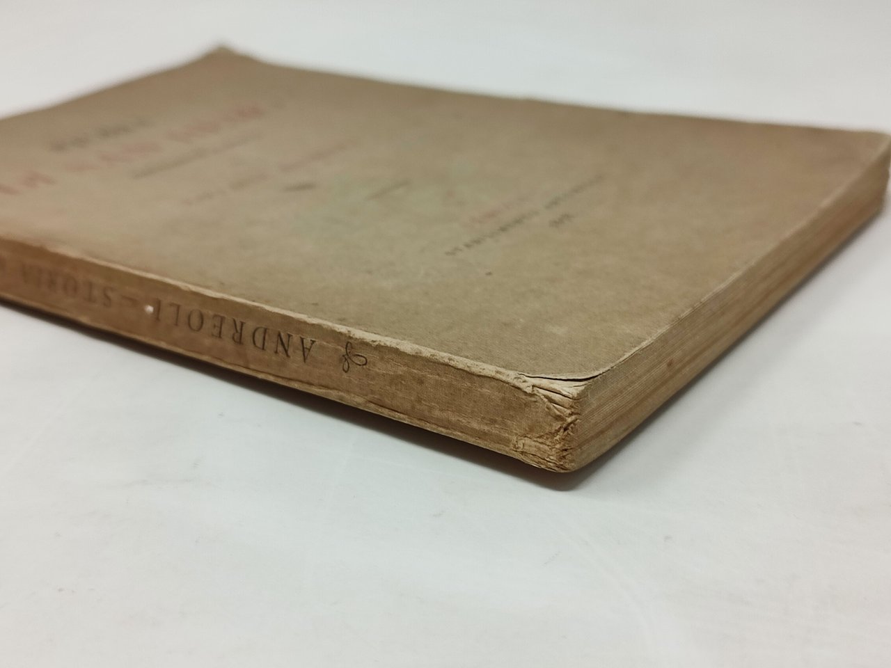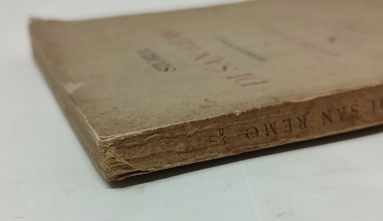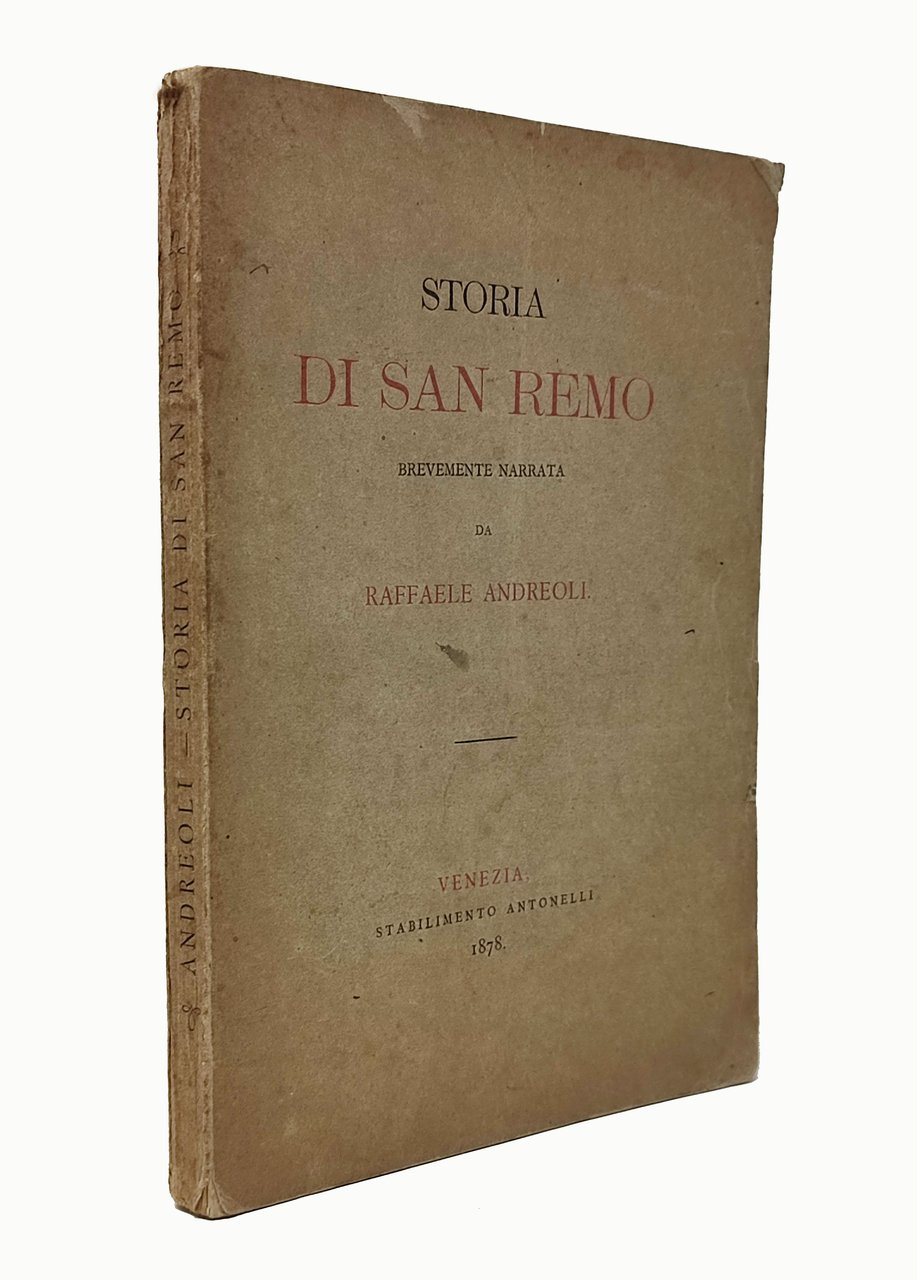 “Storia di San Remo brevemente narrata da Raffaele Andreoli” Venezia, Stabilimento Antonelli 1878. 167 pagine. Formato: 13 x 18,5 cm circa. Stato di conservazione: qualche minuscola “orecchia” di qualche pagina iniziale, qualche leggera brunitura su qualche pagina, piccoli taglietti sulle estremità del dorso (con minuscole mancanze del rivestimento) ma, comunque, un buon esemplare. Privo di scritte o segni nel testo. brossura editoriale con copertina flessibile e titoli in bicromia.