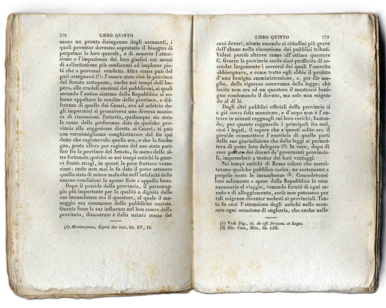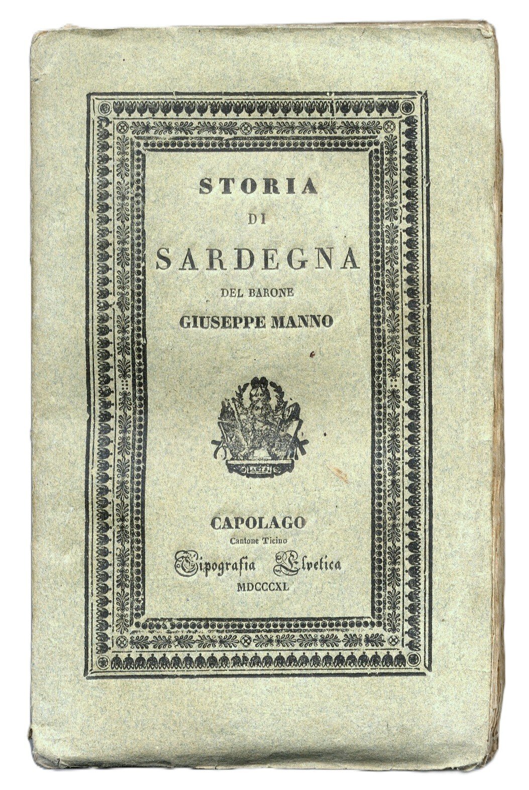 >3 volumi in-8, pp. VIII, 471, 393, 429, brossure originali, titolo entro bordura decorativa sui piatti (piccole mancanze agli angoli). Quarta edizisione (prima Torino 1825-27), rivista ed aumentata, della storia plurimillenaria di Sardegna, dalla culturizzazione fenicia alla morte di Carlo Emanuele III nel 1775. Lo studio storico del Manno stimolò altri valenti autori ad approfondire la materia e le ricerche, ma rimane tuttora insuperato per la sua organicità, la forma letteraria e l'uso scrupoloso delle fonti documentarie. Esemplare assai bello, intonso a pieni margini, sporadiche fioriture. Ciasca, Bibliogr, Sarda. N-10460.