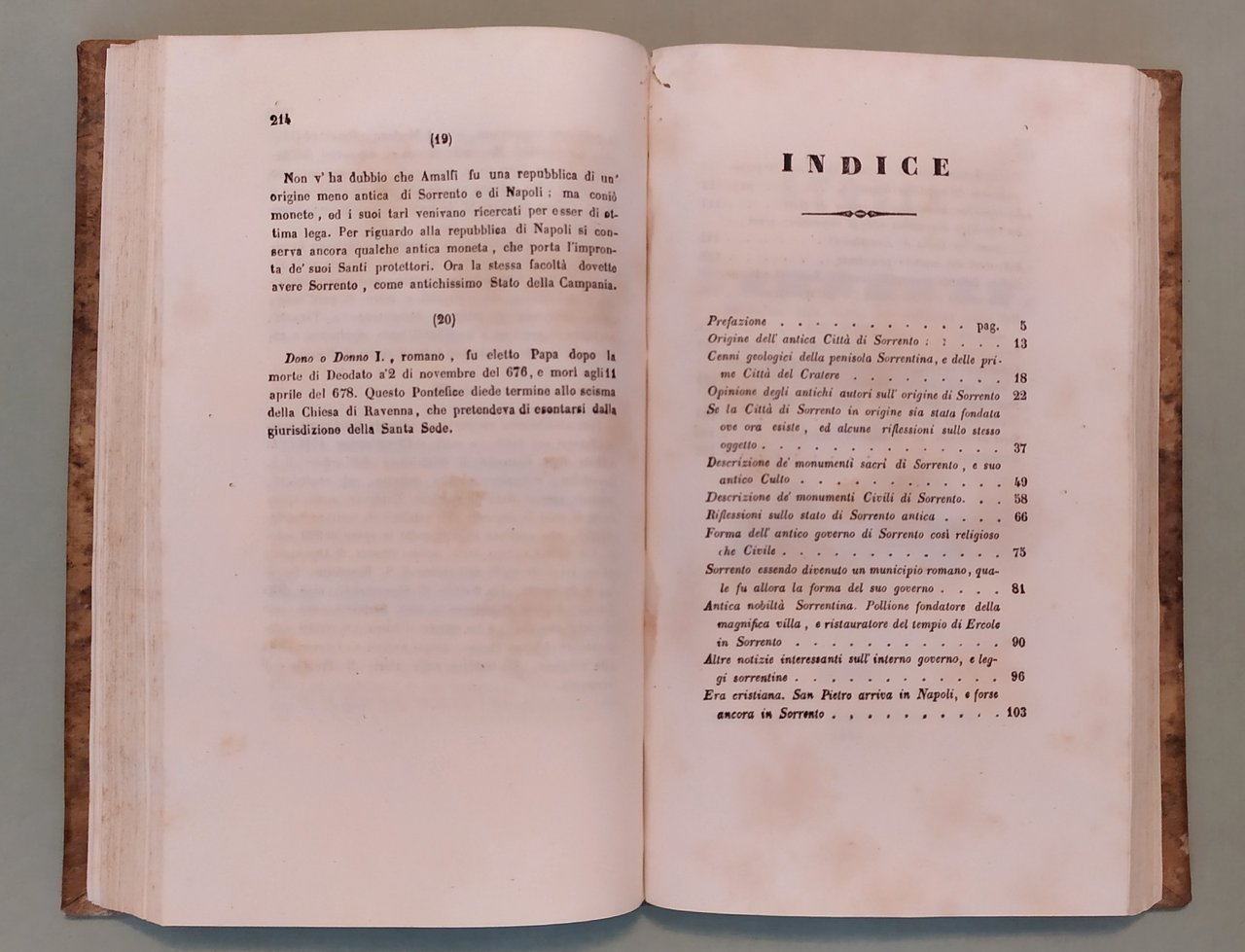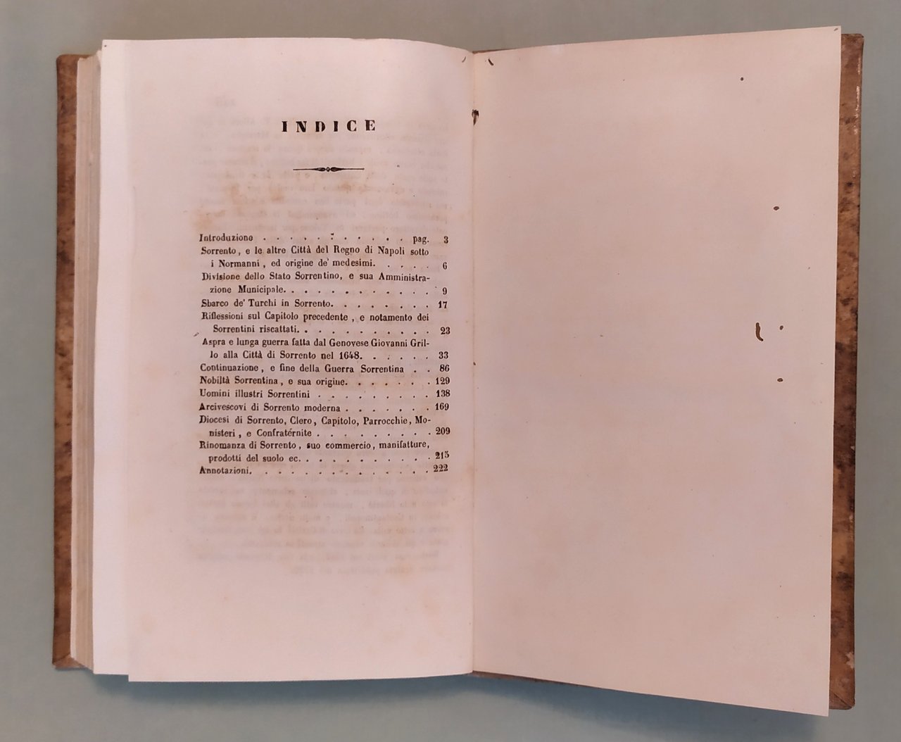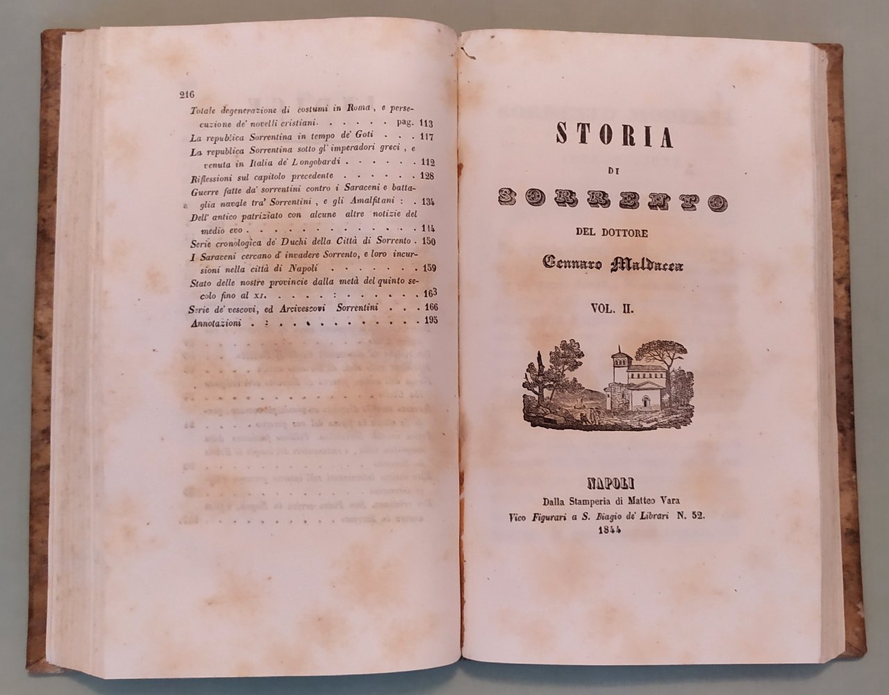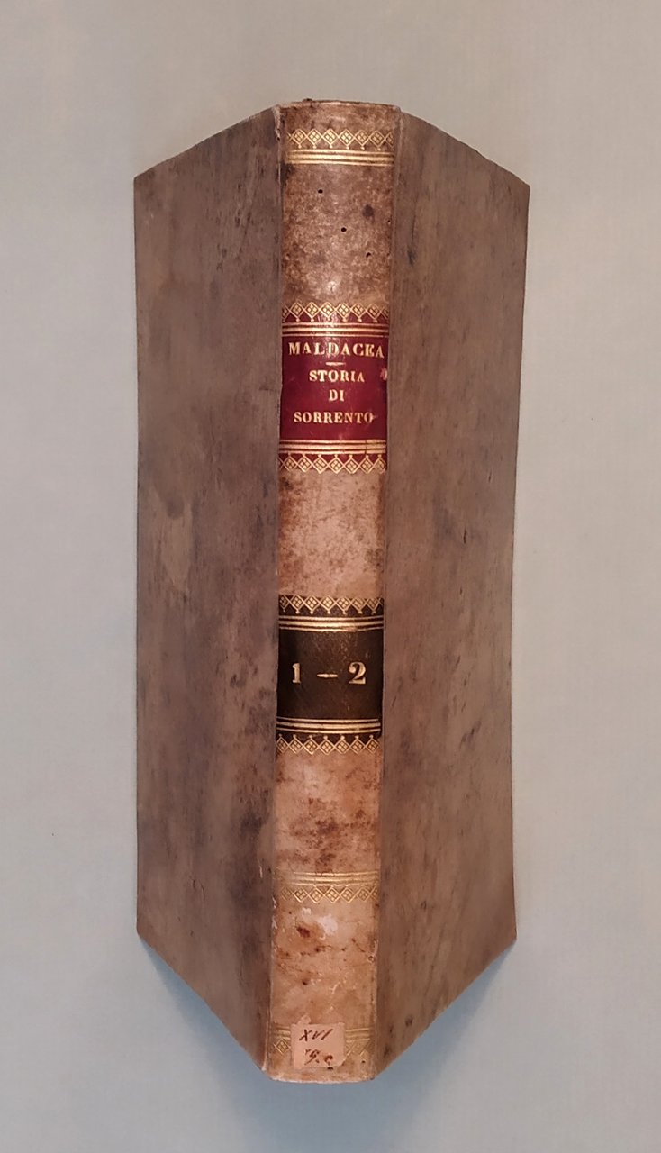 Napoli, Vara, 1841-1844. Due tomi in un volume in 8vo; pp.216;225,1n.n con index. Vignetta ai frontespizi. Cart. marmorizzato, doppio tassello al dorso con titolo e fregi in oro. Origini, cenni geologici, i nobili, le guerre, i Saraceni, i vescovi, i Turchi, uomini illustri, commercio, manifatture, prodotti del suolo. Tutta la storia della città. Prima edizione rara. Doria, Bibl. della Penisola Sorrentina, 229; Lozzi, 5211; Furcheim, Bibl. der Insel Capri und her Sorrentiner Halbinsel, pag.82.