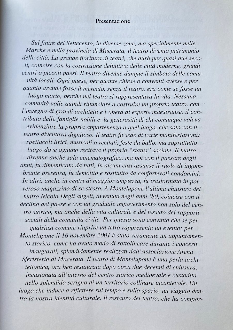 Presentazione. Sul finire del Settecento, in diverse zone, ma specialmente nelle Marche e nella provincia di Macerata, il teatro diventò patrimonio delle città. La grande fioritura di teatri, che durò per quasi due secoli, coincise con la costruzione definitiva delle città moderne, grandi centri o piccoli paesi. Il teatro divenne dunque il simbolo delle comunità locali. Ogni paese, per quante chiese o conventi avesse e per quanto grande fosse il mercato, senza il teatro, era come se fosse un luogo morto, perchè nel teatro si rappresentava la vita. Nessuna comunità volle quindi rinunciare a costruire un proprio teatro, con l'ingegno di grandi architetti e l'opera di esperte maestranze, il contributo delle famiglie nobili e la generosità di chi comunque voleva evidenziare la propria appartenenza a quel luogo, che solo con il teatro diventava dignitoso. Il teatro fu sede di varie manifestazioni: spettacoli lirici, musicali o recitati, feste da ballo, ma soprattutto luogo dove ognuno recitava il proprio status sociale. Il teatro divenne anche sala cinematografica, ma poi con il passare degli anni, fu dimenticato da tutti, In alcuni casi assunse il ruolo di ingombrante presenza, fu demolito e sostituito da confortevoli condomini. In altri, anche in centri di maggior ampiezza, fu trasformato in polveroso magazzino di se stesso. A Montelupone l'ultima chiusura del teatro Nicola Degli angeli, avvenuta negli anni '80, coincise con il declino del paese e con un graduale impoverimento non solo del centro storico, ma anche della vita culturale e del tessuto dei rapporti sociali della comunità civile. Per questo sono convinto che se per qualsiasi comune riaprire un tetro rappresenta un evento; per Montelupone il 16 novembre 2001 è stato veramente un appuntamento storico, come ho avuto modo di sottolineare durante i concerti inaugurali, splendidamente realizzati dall'Associazione Arena Sferisterio di Macerata. Il teatro di Montelupone è una perla architettonica, ora ben restaurata dopo circa due decenni di chiusura, incastonata all'interno del centro storico medioevale e custodita nello splendido scrigno di un territorio collinare incantevole. Un luogo che induce a riflettere sul tempo e sullo spazio, un viaggio dentro la nostra identità culturale.