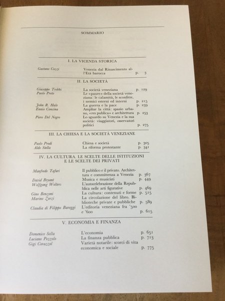 Monumentale opera dedicata alla storia di Venezia, dalle origini al '900, e dei suoi aspetti culturali ed artistici. I primi 8 volumi sono costituiscono un corpus ordinato cronologicamente: origini ed età ducale; l'età del comune; la formazione dello stato patrizio; il Rinascimento - politica e cultura; il Rinascimento - società ed economia; dal Rinascimento al Barocco; la Venezia Barocca; l'ultima fase della Serenissima. I restanti 6 volumi sono organizzati per temi: il mare; l'arte - volume 1; l'arte - volume 2; l'Ottocento e il Novecento ( volumi 1, 2 e 3 ).