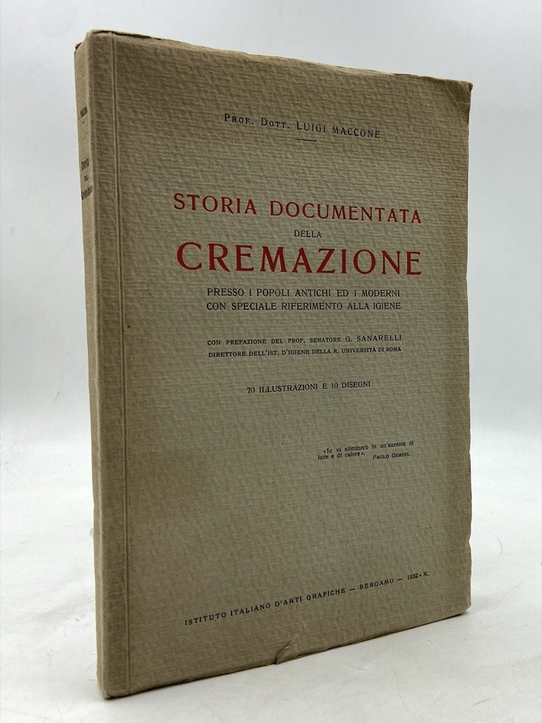 Brossura editoriale, cm 23 x 15.5, pp 241 (2), 70 fotografie in nero fuori testo e 10 disegni nel testo. Prefazione di G. Sanarelli. Monografia del pediatra e storico dell’arte Luigi Maccone che si inserisce nel dibattito cremazionista italiano portando elementi storici, con un excursus sulle civiltà antiche e una più dettagliata esposizione dedicata ai secoli XVIII-XX in Europa, e ragioni di salute pubblica a favore della cremazione; presenta inoltre informazioni tecniche, descrizione degli impianti, notizie sui cimiteri, la medicina legale ecc.