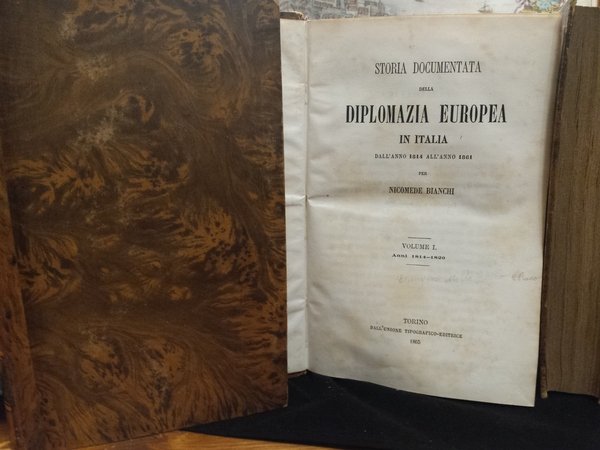 In-8 (22 cm) 8 voll. (8) 471 (1); 435; 474 (2); 410 (2); 541 (3); 613 (3); 679 (1); 719 (1). All'occhietto il titolo: "Storia della diplomazia europea in Italia". Legatura in mezza pelle, titolo in oro al dorso. Importante opera molto ricercata per la quantità di documenti inediti e della relativa bibliografia con riferimenti alle fonti, che l'arricchiscono. Sul front. dei V-VII: Torino ; Napoli : dalla Soc. l'Unione tipografico-editrice; v. 8: Napoli; Roma: Unione tipografico-editrice torinese. Qualche fioritura. Bell'esemplare raro nella sua completezza.