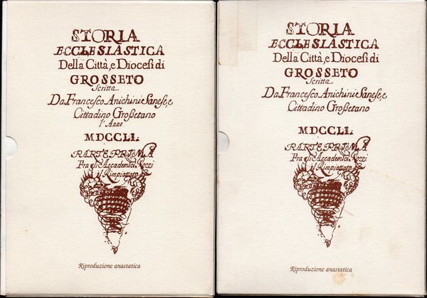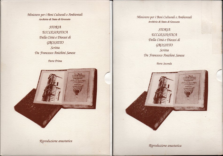 Sei tomi in-4° (28,9 x 20,5 cm) pagine non numerate 194; 200; 194; 236; 212; 240, copertina editoriale con qualche lieve, normale segno del tempo. I sei tomi, tre che riproducono la parte prima del manoscritto, tre che riproducono la parte seconda, sono contenuti in due cofanetti editoriali in cartoncino. Ai dorsi dei tomi e dei cofanetti, alla faccia inferiore del cofanetto con la parte prima e alla faccia superiore del cofanetto con la parte seconda, è indicata, in numeri romani, a penna, la parte in essa riprodotta, o nel caso dei cofanetti, contenuta. I dorsi dei singoli tomi delle due parti sono poi numerati, nella parte inferiore, sempre a penna, con cifre arabe (da 1 a 3). I cofanetti presentano qualche segno d'uso e del tempo, in particolare, quello contenente la parte seconda presenta uno strappo lungo lo spigolo tra la faccia superiore e quella laterale sinistra, sistemato da vecchio proprietario con nastro adesivo. Per il resto, in ottimo stato. Nota di spedizione: il peso complessivo dei volumi, debitamente imballati per l'invio, supera i 4 chilogrammi. Si tratta della ristampa anastatica dell'opera manoscritta Storia ecclesiastica della Città, e Diocesi di Grosseto redatta nel 1751-1752 dal cancelliere Francesco Anichini, scritto di importanza fondamentale per lo studio della Maremma grossetana. Dettaglio dei tomi, con riferimento alla cartulazione del manoscritto: Parte prima, 1751. Tomo 1° da carta 1 a carta 84 recto; Tomo 2° da carta 84 verso a carta 180 verso; Tomo 3° da carta 181 verso a carta 281 verso. Parte seconda, 1752. Tomo 1° da carta 1 a carta 113 verso; Tomo 2° da carta 114 recto a carta 216 verso; Tomo 3° da carta 217 recto a carta 337 recto.