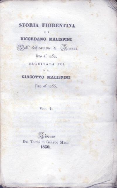 STORIA FIORENTINA. Dall'edificazione di Firenze fino al 1282. Seguitata poi da Giacotto Malispini fino al 1286.