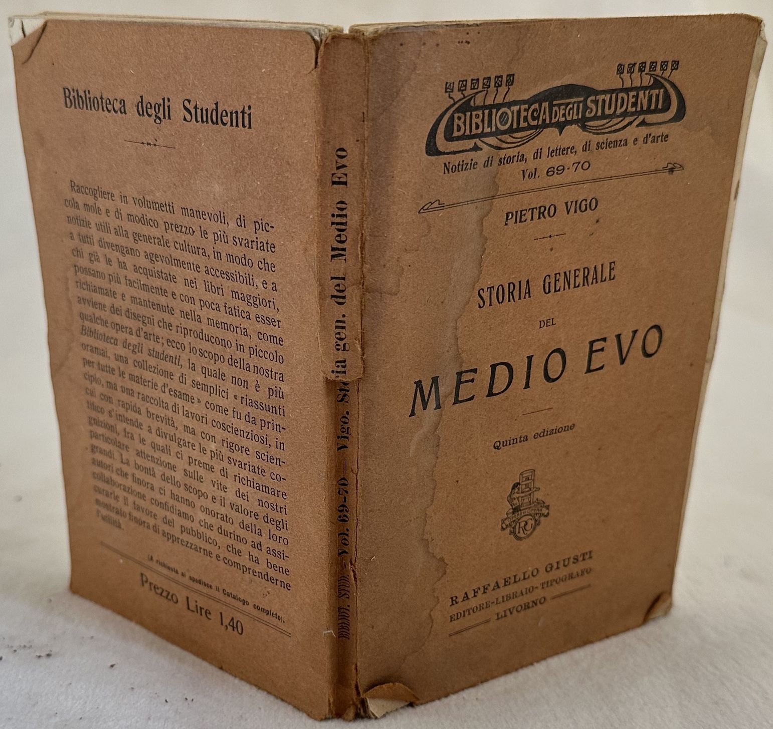 Edizione del 1915 di questa opera sulla storia del Medioevo a cura di Pietro Vigo della collana "Biblioteca degli studenti". In discrete condizioni. Copertina editoriale in discrete condizioni generali con lievi usure ai margini e dorso. Copertina in parte staccata. Legatura in discrete condizioni con rotture. All'interno le pagine si presentano in buone condizioni con rare fioriture. Lievi gore d'umidità. In 16. cm. 16x10,5. Pp. (10)+180.Edition of 1915 of this work about the history of Middleage written by Pietro Vigo of the series "Biblioteca degli studenti". In fair conditions. Editorial cover in fair general conditions lightly worn in the extremities. Cover partially detached. Binding in fair conditions with light cracks. Inside pages are in good conditions with occasional foxing. Light dump stains. In 16. cm. 16x10,5. Pp. (10)+180.