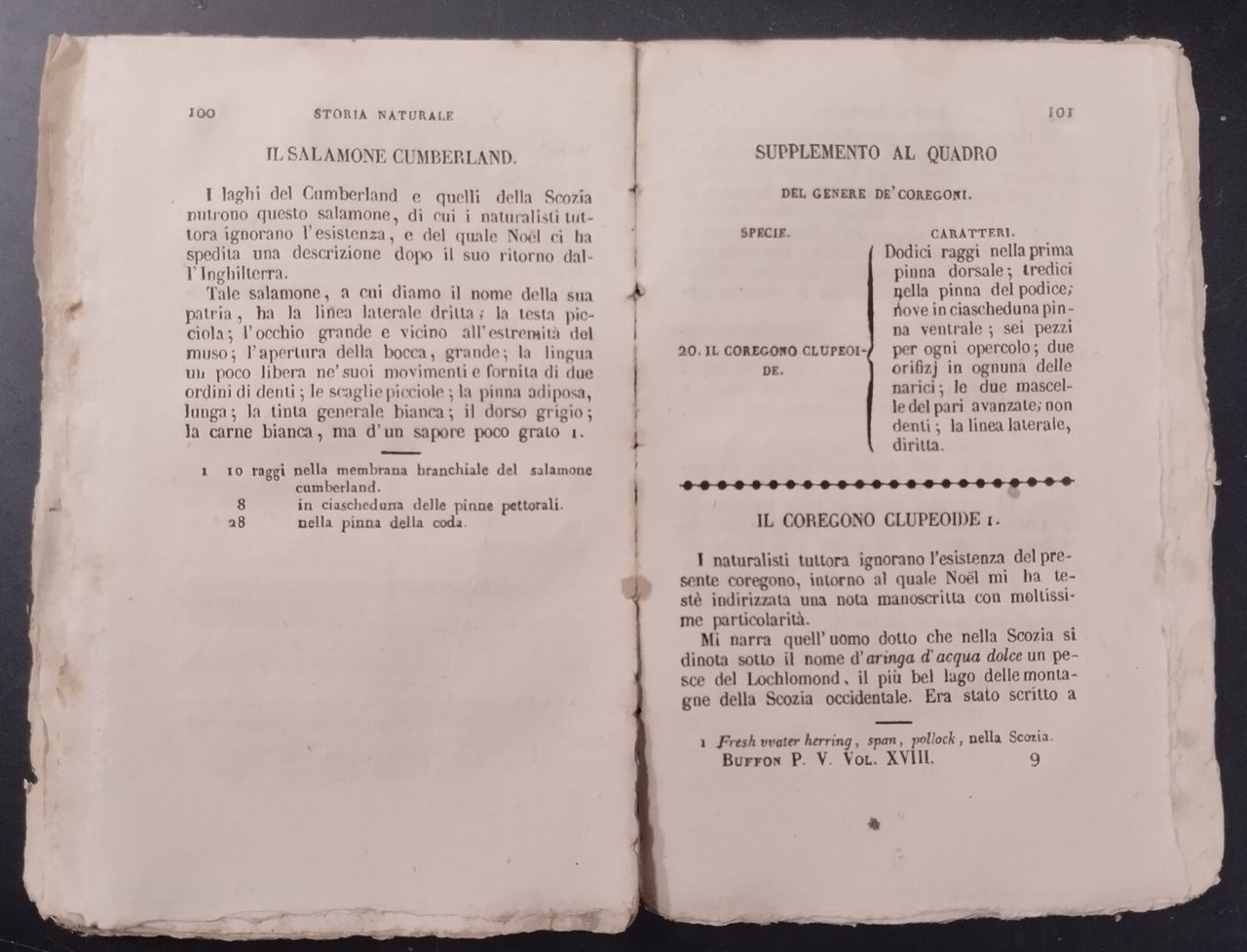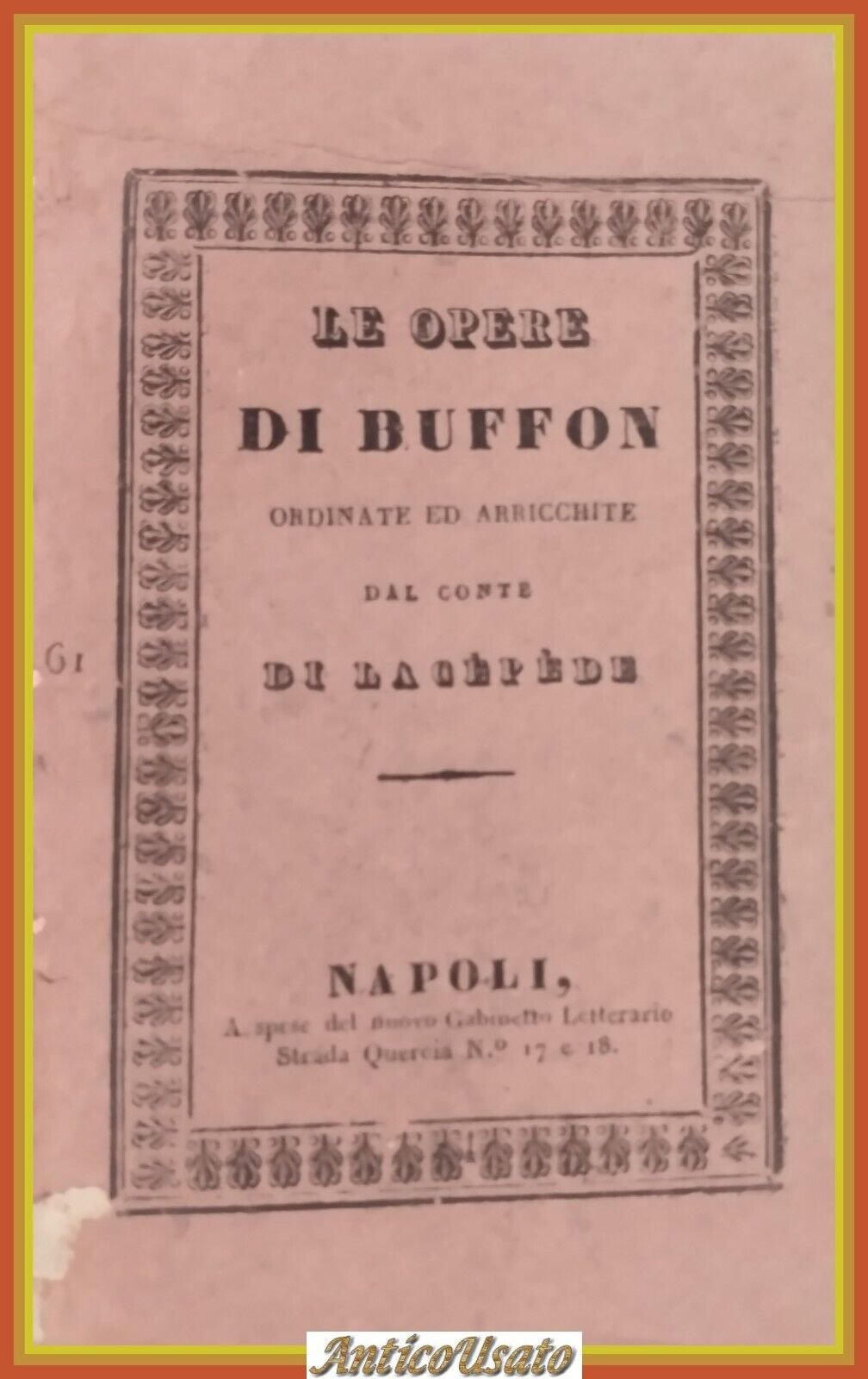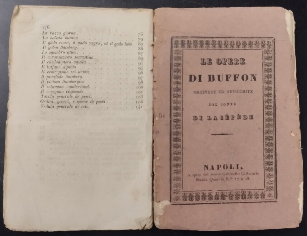 Napoli, a spese del nuovo gabinetto letterario, 1841. “Le opere di Buffon nuovamente ordinate ed arricchite della sua vita e di un ragguaglio dei progressi della storia naturale dal MDCCL in poi dal conte di Lacepede e di un’appendice de’ sigg Daupin, Larreile, Sonnini” Parte V, vol XVIII “storia generale de’ quadrupedi ovipari de serpenti e de pesci”. 176 pagine. copertina editoriale in carta. Dimensioni: 10 x 16 cm. Stato di conservazione: buono (manca il piatto posteriore e il dorso, piccole mancanze al piatto anteriore, qualche fioritura, legatura allentata) Libro antico saggistica biologia