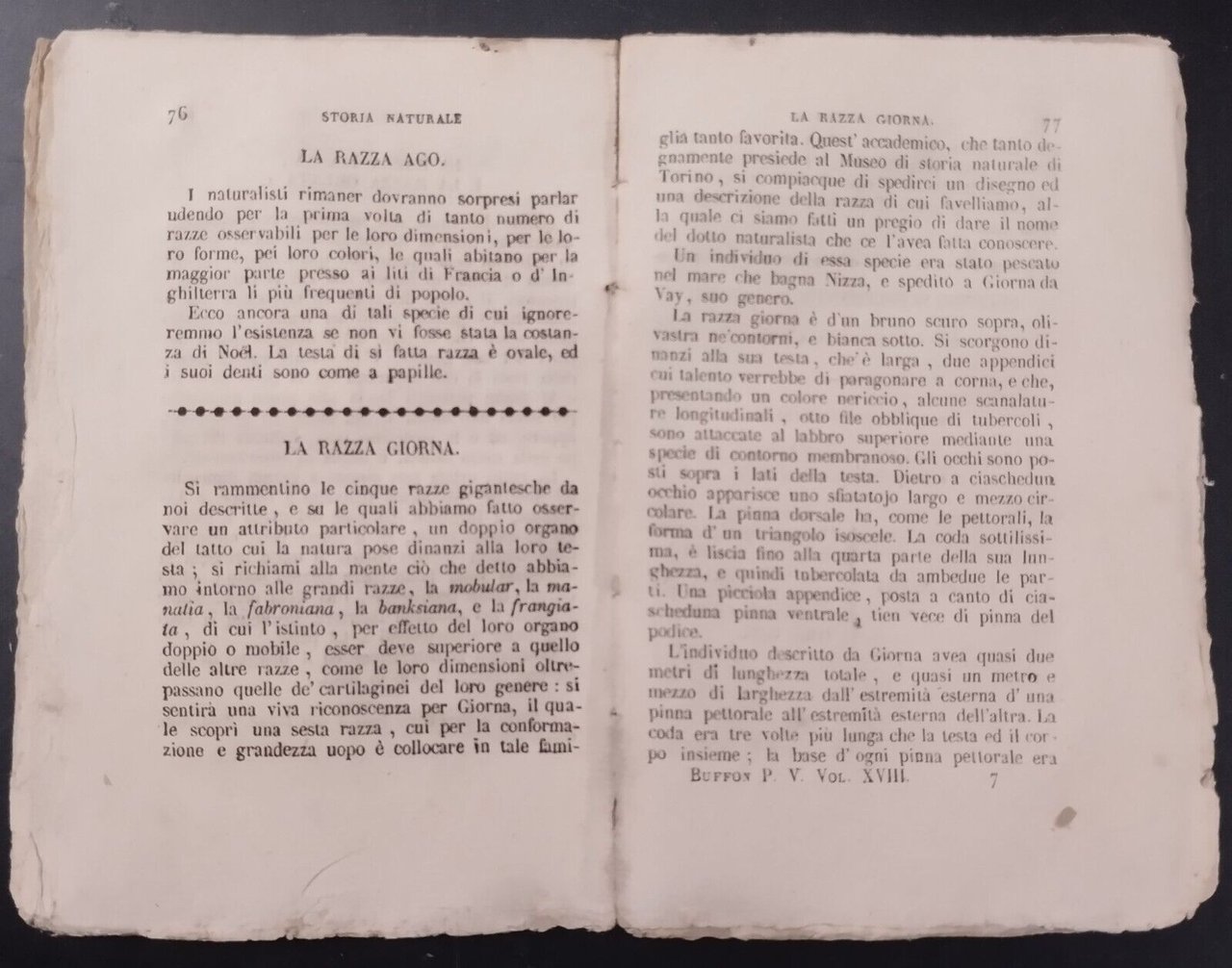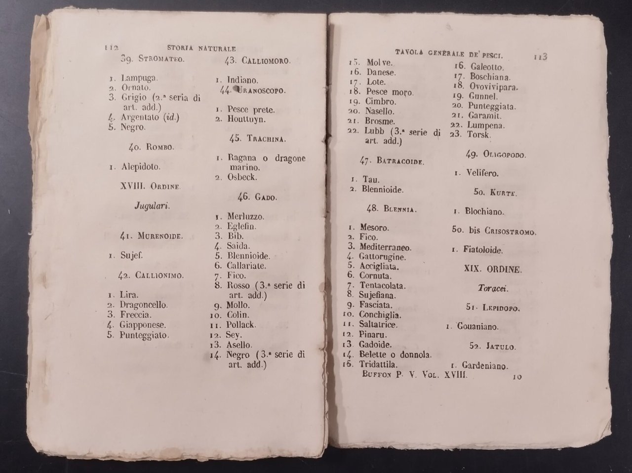 STORIA GENERALE DE’ QUADRUPEDI OVIPARI DE SERPENTI E DE PESCI parte V volume XVIII di Buffon. Il mormiro, murenofidi, discorso sulla pesca e i pesci fossili ecc.