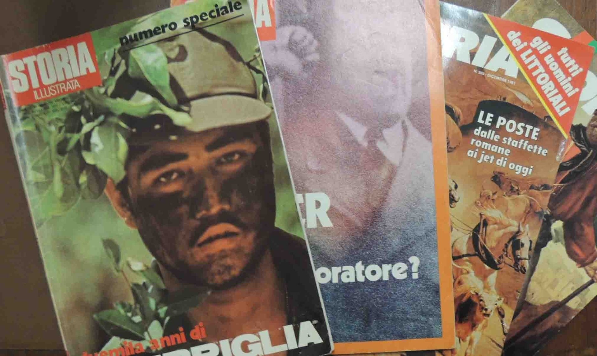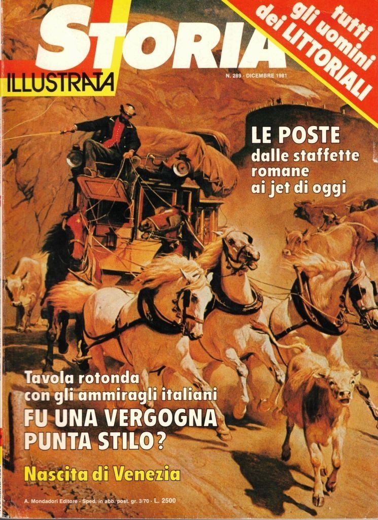 Storia illustrata, Arnoldo Mondadori Editore, Milano , 4 numeri, 1973-1982, pp. 567, ill. b.n. e col., cm 28, br. ed. Il lotto comprende i seguenti quattro numeri del mensile Storia Illustrata: Storia Illustrata, n. 180, novembre 1972, pp. 162 – Storia illustrata n. 192, novembre 1973, pp. 146 – Storia illustrata, n. 289, dicembre 1981, pp. 129 – Storia illustrata, n. 294, maggio 1992, pp. 130. Indice n. 180, novembre 1972 (numero speciale monografico dal titolo: Duemila anni di guerriglia): Michele Lanza, La città-stato culla dei guerriglieri – Guido Artom, Il Bonaparte sconfitto dai guerrilleros – Mino Milani, I briganti del sud in lotta coi Piemontesi – Franco Bandini, Lawrence d’Arabia visionario della guerriglia – Guido Gerosa, Irlanda: una lotta che dura da sessant’anni – Paolo Maltese, Sempre inquieto l’impero di Mussolini – Davide Lajolo, La Resistenza: nasce la guerra per bande – Giuseppe Mayda, Indocina: la tigre contro l’elefante bianco – Raffaele Uboldi, Fu vinta nella casbah la guerra d’Algeria – Antonangelo Pinna, A Fort Bragg con i Berretti Verdi – Franco Pierini, In Sudamerica gli eredi di Villa e Zapata – Toti Celona, Nell’Africa Nera la violenza è legge – Maurizio Chierici, I fanatici fedayn da Al Fatah a Settembre nero – Giorgio Bocca, Vietcong: tecniche primitive per mezzi moderni – Rubriche. Indice n. 192, novembre 1973: Dante Virgili, La voce folle del nazismo – Mario Lombardo, La resa dell’isola di Lero – Pier Gildo Bianchi, Il tempo dei monatti – Giorgio Bonacina, Il bombardiere che piegò il Giappone – Lino Pellegrini, Le guerre di Malaparte – Franco Rho, Curacao l’Olanda dei Tropici – Walter Rosboch, Il museo dei carri armati – Sabatino Moscati, Nuova luce su Cartagine – Maria Luisa Rizzatti, Grant il presidente travolto dagli scaldali – Giampaolo Calchi Novati, Trieste ribelle agli alleati – Luigi Bàcolo, Domiziano l’ultimo dei Cesari – Rubriche. Indice n. 289, dicembre 1981: Giorgio Migliavacca, La storia delle poste dalle staffette romane al jet – Ugoberto Alfassio Grimaldi, Tutti gli uomini dei Littoriali – Mario Gandini, Il sacco di Roma del 1527 – Giorgio Bonacina, L’atletica moderna nata da una scommessa – Le dinastie d’Europa. 18: Regno di Napoli e Sicilia – Sabatino Moscati, Italia riscoperta. 5: Civiltà indigene nel Sud – Bruno Traversari, la terza verità sull’assassinio del padre di Pascoli – Ezio Benetti, Cent’anni fa l’uccisione dello zar Alessandro II – John Julius Norwich, Venezia, la città nata dalla paura – Giuseppe Barigazzi, Da cinque secoli il panettone – Fu una vergogna Punta Stilo?, tavola rotonda a cura di F. Bandini – Rubriche. Indice n. 294, maggio 1982 (Speciale Garibaldi): Messaggio del Capo dello Stato Sandro Pertini – Giovanni Spadolini, Il mio Garibaldi – Max Gallo, La giovinezza a Nizza – Montanelli: gli voglio bene, ma…, a cura di L. Orlandini – Le dinastie d’Europa. 23: Ducato di Ferrara e di Modena – Denis mack Smith, Perché garibaldi piaceva tanto agli inglesi – Luigi Florio, Con cavour fu subito scontro – Ugo Bellocchi, E i giornali italiani si chiamarono Garibaldi – I cimeli – La sua vita, a cura di G. Ambrosio – Silvia Alberti de Mazzeri, Le donne del guerriero – Ricciotti lazzero, I Garibaldi – Carlo Mansuino, Garibaldi nei libri di tutto il mondo – Silvio Bertoldi, Vittorio Emanuele III a trentacinque anni dalla morte. 3: il Re e il fascismo – Rubriche. Tracce d’uso, ma comunque buone copie.