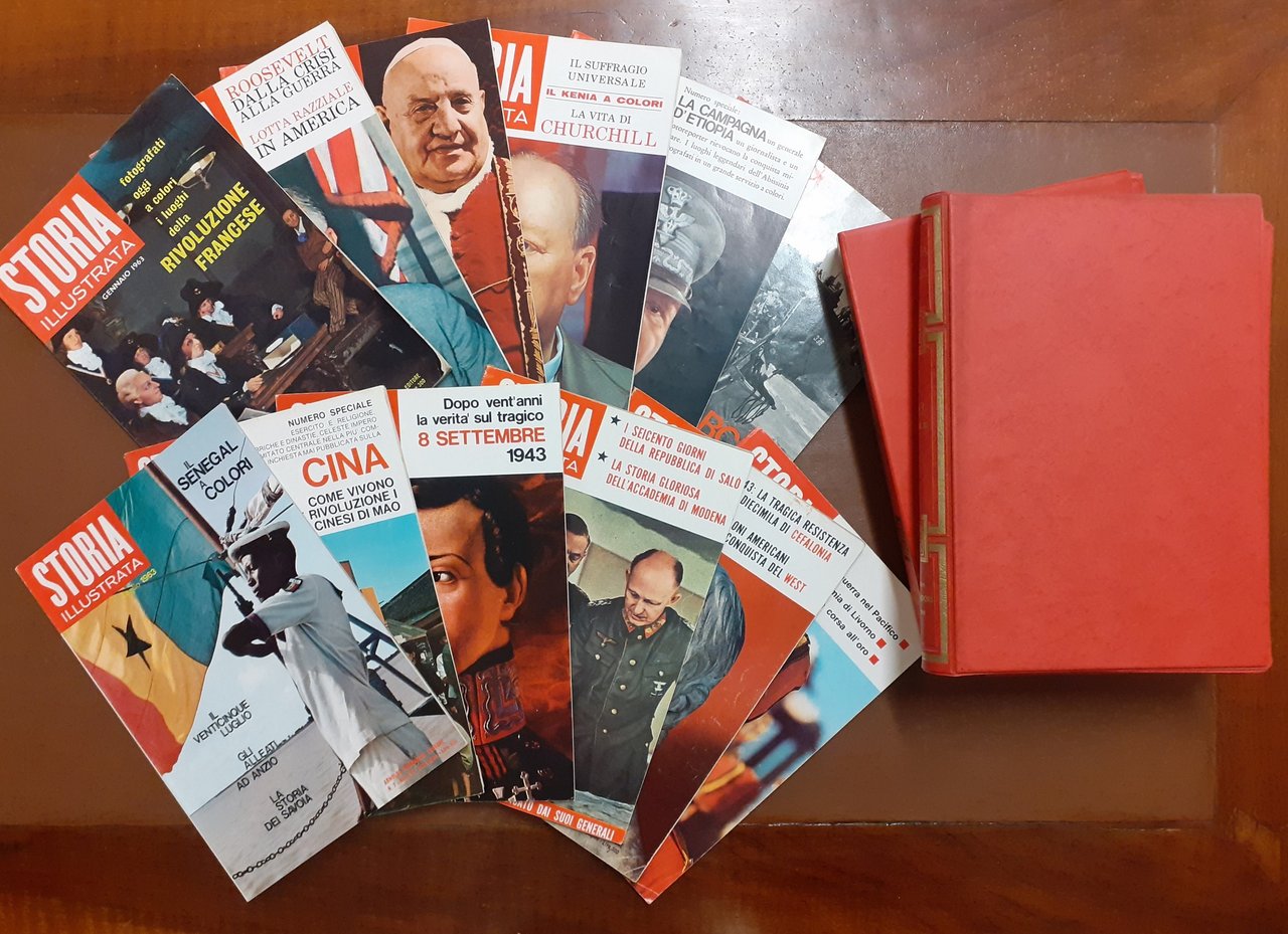Storia illustrata. Mensile di storia archeologia e geografia, direttore responsabile Gino Pugnetti, anno VII, numeri 1-12, gennaio-dicembre 1963 (annata completa in cofanetti), Arnoldo Mondadori Editore, s.l. (ma stampato a Verona, pressoOfficine Grafiche Arnoldo Mondadori), pp. totali 1776 (pp. 148 per fascicolo), ill. b.n. e col., cm 26, br. ed. Annata completa in cofanetti editoriali, uno per semestre. In chiusura dei fascicoli di giugno e dicembre, indice del semestre. Numeri speciali monografici: n. 3, marzo 1963 (Numero speciale dedicato al Vaticano) – n. 5, maggio 1963 (La campagna d’Etiopia) – n. 8, agosto 1963 (Cina. Come vivono tra passato e rivoluzione i cinesi di Mao). Leggere tracce d’uso, qualche sgualcitura, per il resto esemplari molto ben conservati.