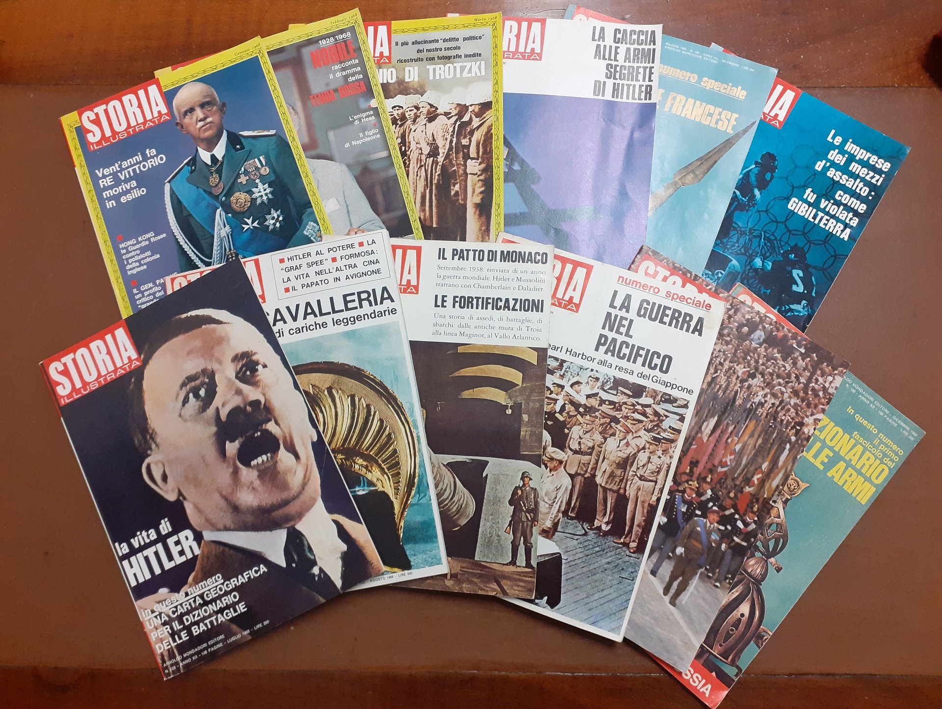 Storia illustrata, direttore responsabile Gino Pugnetti, poi Giulio Nascimbeni, anno XII, numeri 122-133, gennaio-dicembre 1968 (annata completa in cofanetti), Arnoldo Mondadori Editore, Milano, pp. totali 1816, ill. b.n. e col., cm 26, br. ed. Annata completa in cofanetti originali, uno per semestre. In chiusura dei fascicoli di giugno e dicembre, indice del semestre. In testa alla prima di copertina dei numeri di gennaio, febbraio e marzo: Serie del decennale. Numeri speciali monografici: n. 126, maggio 1968 (La rivoluzione francese) – n. 131, ottobre 1968 (La guerra nel Pacifico. Dall’attacco di Pearl Harbor alla resa del Giappone). Leggere tracce d’uso, per il resto esemplari ben conservati.