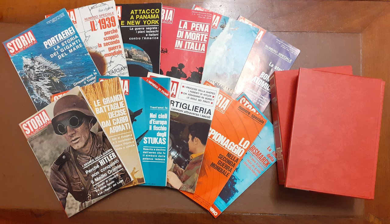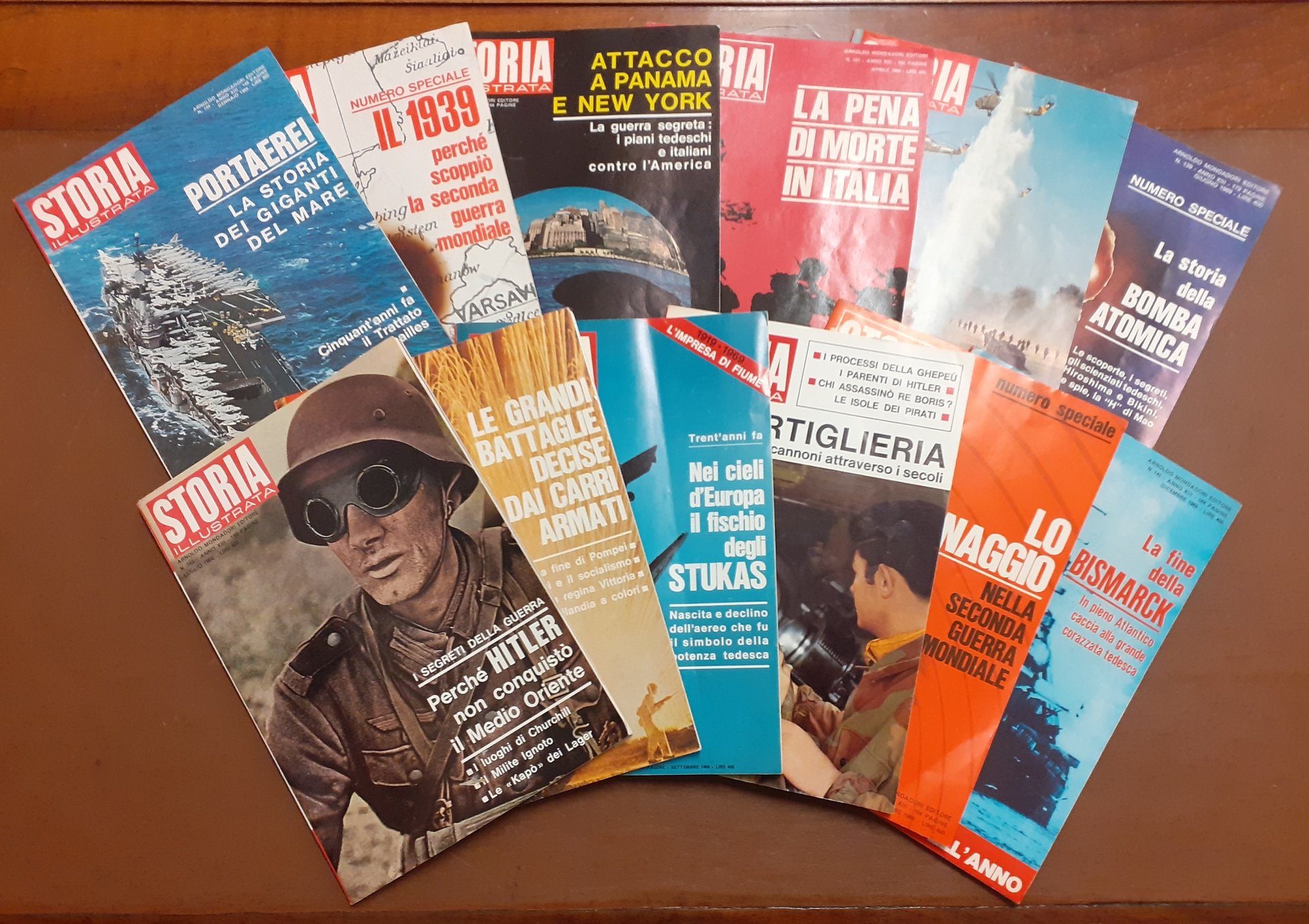 Storia illustrata, direttore responsabile Giulio Nascimbeni, anno XIII, numeri 134-145, gennaio-dicembre 1969 (annata completa in cofanetti), Arnoldo Mondadori Editore, Milano, pp. totali 1860, ill. b.n. e col., cm 26, br. ed. Annata completa in cofanetti originali, uno per semestre. In chiusura dei fascicoli di luglio e dicembre, indice del semestre. Numeri speciali monografici: n. 135, febbraio 1969 (Il 1939. Perché scoppiò la seconda guerra mondiale) – n. 139, giugno 1969 (La storia della bomba atomica) – n. 144, novembre 1969 (Lo spionaggio nella seconda guerra mondiale). Un numero (marzo) con alcune pagine ripiegate all’angolo superiore esterno per sovrabbondanza di carta, leggere tracce d’uso, per il resto esemplari molto ben conservati.