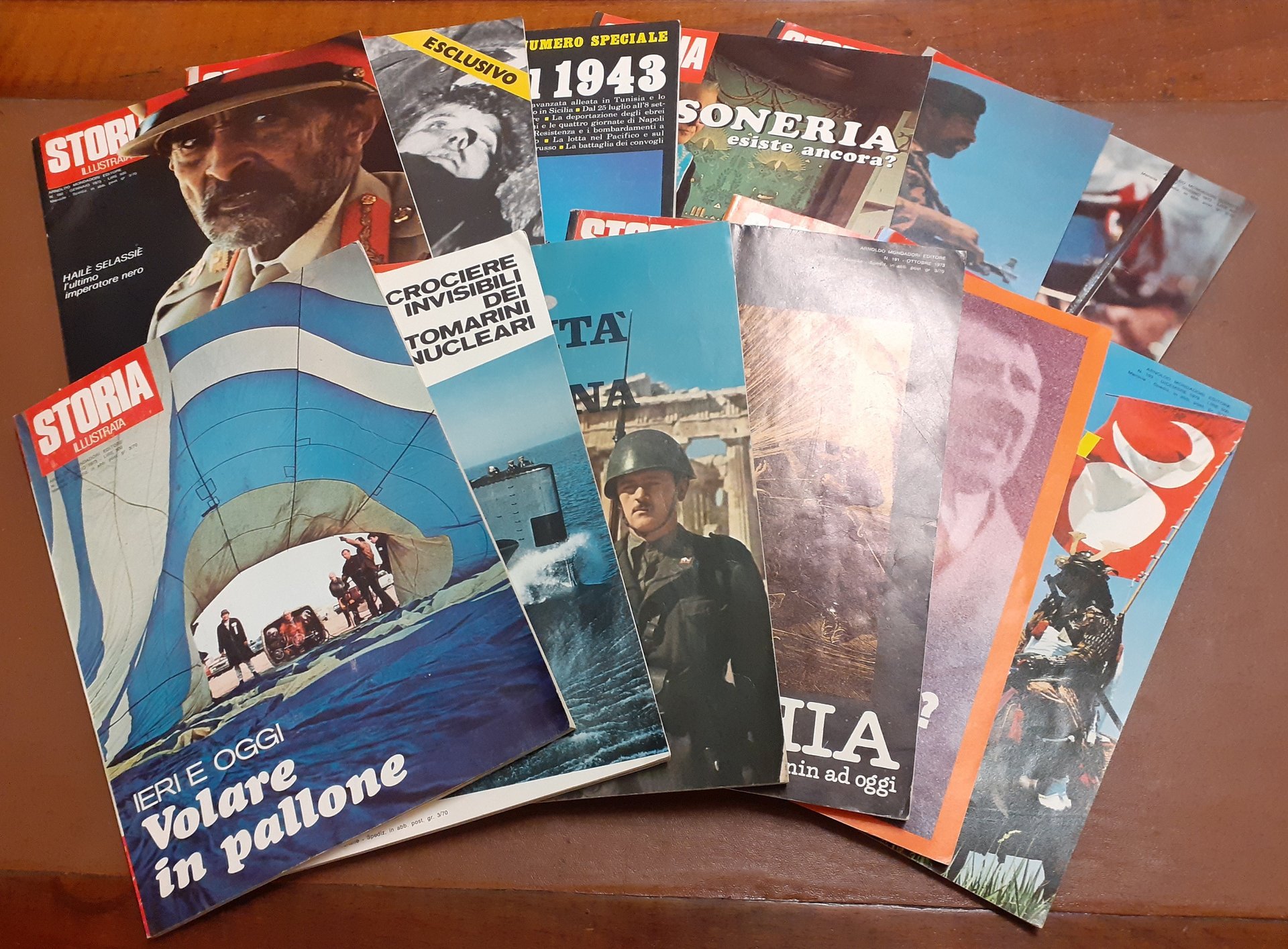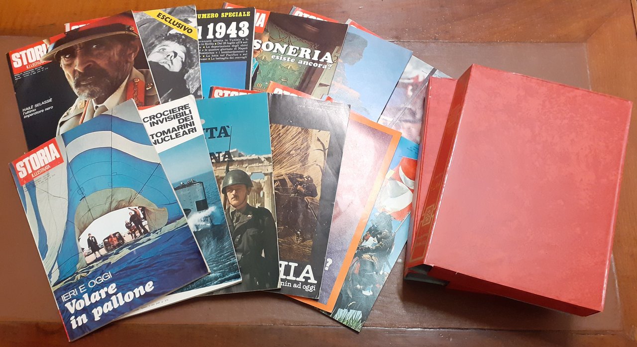Storia illustrata, direttore responsabile Carlo Castellaneta, numeri 182-193, gennaio-dicembre 1973 (annata completa in cofanetti), Arnoldo Mondadori Editore, Milano, pp. totali 1840, ill. b.n. e col., cm 29, br. ed. Annata completa in cofanetti originali, uno per semestre. Numeri speciali monografici: n. 184, marzo 1973 (Il 1943) – n. 191, ottobre 1973 (Anarchia. Utopia, rivolte e attentati da Bakunin ad oggi). Leggere tracce d’uso, per il resto esemplari ben conservati.
