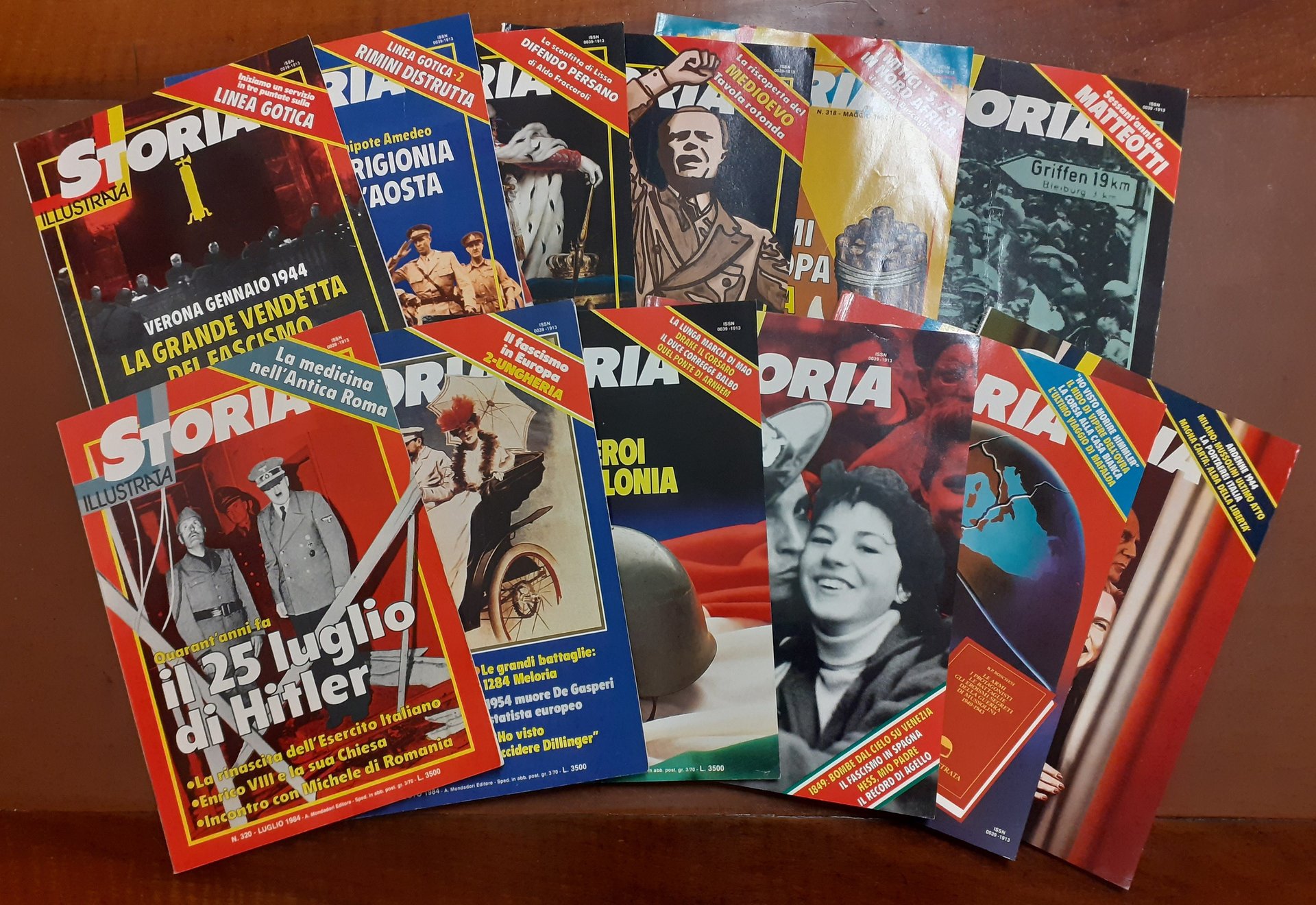 Storia illustrata, direttore Pier Maria Paoletti, numeri 314-325, gennaio-dicembre 1984 (annata completa), Arnoldo Mondadori Editore, Segrate, pp. totali 1560 (pp. 130 per fascicolo), ill. b.n. e col., cm 29, br. ed. Annata completa. Leggere tracce d’uso, per il resto fascicoli ben conservati.