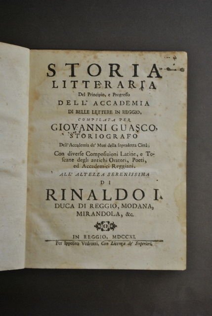 Storia Litteraria Accedemia Muti Belle Lettere Reggio Guasco Storiografo 1711