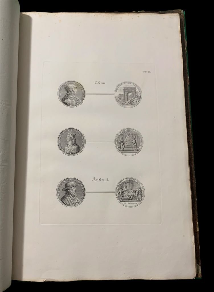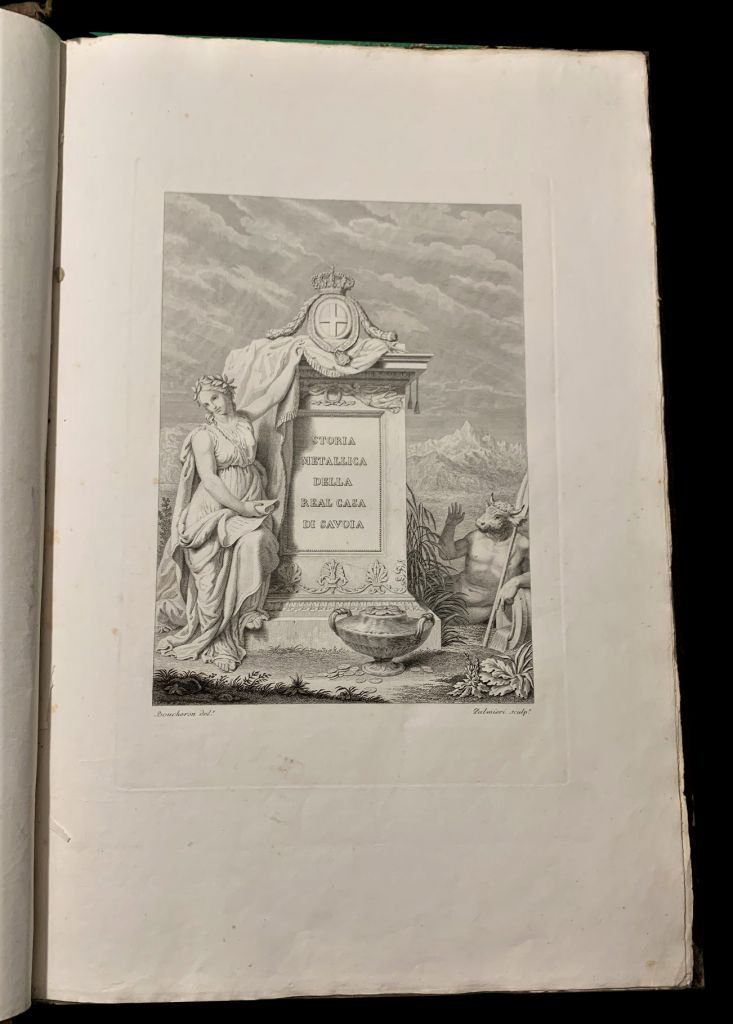 In folio (mm. 48x32 cm); (4, compresi titolo inciso da Palmieri su disegno di Boucheron e dedica), VIII, (2) pp., I-XXVII tavole numerate, (56) pp. contenenti la "Spiegazione delle medaglie". Legatura coeva in mezza pelle con titolo e filetti in oro su tassello rosso al dorso. Qualche lieve segno del tempo e strofinatura ma nel complesso, esemplare in buone-ottime condizioni di conservazione e praticamente privo delle solite macchioline di foxing presenti in quasi tutti gli esemplari. Il nostro esemplare si presenta anche a fogli ancora in barbe. Prima ed unica edizione di questa monumentale opere dedicata alle medaglie sabaude stampate fino al 1828. Antiporta inciso all'acquaforte dal Palmieri su invenzione del Boucheron. Dopo la dedicatoria e lo scritto di Napione Galeani, seguono le bellissime 27 tavole raffiguranti medaglie con effigi dei Savoia, numerate I-XXVII. Carlo Emanuele III, nel 1757, chiamò Nel 1757 Carlo Emanuele III ordinò al noto incisore Lorenzo Lavy (figlio dell'altrettanto noto Carlo), di realizzare una serie di medaglie, ognuna intesta ad un Sovrano della Real Casa. Lorenzo Levy, apprendista di Andrea Boucheron, perfezionò la sua arte presso l bottega di Thomas Germain, orefice del re di Francia al Louvre. Come ben scrive, Valentina Sapienza nella voce dedicata a Levy nel "Dizionario Biografico degli Italiani" edito da Treccani (Volume 64, 2005) "A Parigi si dedicò allo studio del disegno e del modellato, cui aggiunse, dal 1743, la pratica dell'incisione di monete e medaglie (Cultura figurativa , III, p. 1456). A consigliarlo in tal senso, con l'obiettivo di fargli guadagnare una professionalità meglio spendibile e più redditizia, fu proprio Andrea Boucheron, con il quale Lorenzo intrattenne una fitta corrispondenza e cui inviò tutti i suoi lavori perché fossero mostrati a corte (Assandria, pp. 214 s.). Il 16 giugno 1745 rientrò a Torino; ma già nell'ottobre successivo raggiunse Roma, provvisto di una pensione mensile di 60 lire, per continuare a perfezionarsi nell'arte dell'incisione (Baudi di Vesme, p. 620). Su interessamento del cardinale Alessandro Albani fu introdotto nella bottega degli Hamerani, incisori presso la Zecca pontificia (ibid.). A Roma si applicò allo studio della medaglistica antica, colmando quel vuoto che la formazione parigina aveva reso inevitabile. Richiamato a Torino nel giugno del 1749 (ibid., p. 622), il 12 novembre dell'anno successivo fu nominato intagliatore di monete e medaglie della Zecca reale con lo stipendio provvisorio di 1000 lire annue, aumentato a lire 1200 nel 1763, quando sostituì completamente il defunto Giovan Battista Donò (ibid., p. 622). [ ] Un discorso a sé merita la serie di settantasette medaglie della Storia metallica di casa Savoia (Torino, Museo civico di numismatica), iniziata nel 1757 per volere di Carlo Emanuele III e terminata solo quindici anni dopo. Per le invenzioni dei soggetti e delle leggende dei rovesci, Lorenzo fu affiancato dall'abate Francesco Berta, bibliotecario dell'Università. I coni, pagatigli solo 118 lire l'uno, rimasero sconosciuti fino a quando Carlo Felice li fece disegnare da Angelo Boucheron e incidere in rame da Pietro Palmieri per illustrare il volume curato da Giovan Francesco Galeani Napione, Storia metallica della Real Casa Savoia (Torino 1828). La serie fu completata e incisa su interessamento di Luigi Torelli, allora ministro dell'Agricoltura, industria e commercio, in visita alla Zecca nel 1864 (Uomini libri medaglieri, pp. 45-51; Popoff). ". L'opera che qui presentiamo, aveva la doppia finalità diplomatico-storica di creare un dono prezioso da lasciare ai regnanti d'Europa e a personalità eminenti e di creare una collezione che sarebbe, poi, rimasta nel corso del tempo. In realtà, dopo la morte del Duca, per le ingenti spese richieste per la coniazione le medaglie non vennero mai battute. Il progetto finì per qualche tempo nel dimenticatoio, fino a quando, alcune persone vicine al Re Carlo Felice perorò la causa di riprendere e portare a conclusione il piano dell'opera. Fu così contattato l'incisore Pietro Calmieri che finì di realizzare tutte le medaglie, che videro, però, la luce solo nel 1864 quando il ministro dell'Agricoltura, dell'Industria e del Commercio, Luigi Torelli visitò la zecca e casualmente, notò i coni inutilizzati. Interessatosi della cosa, chiese cosa fossero e quando gli fu descritto di cosa si trattasse, diede immediatamente ordine di finire il progetto. Rif. Bib.: Bassoli, Monete e medaglie nel libro antico, p. 74; Manno, I, 575.
