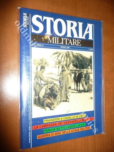 DESCRIZIONE: Storia Militare, n. 57, Anno VI, Giugno 1998, Parma. Titoli di copertina: Finanzieri a cavallo in Libia; La campagna dei Dardanelli nel 1915; Perchè Botto lasciò l'A.N.R.; Guerra di mine nelle acque maltesi. Storia Militare è la prima rivista mensile italiana dedicata alla storia militare in genere. In edicola tutti i mesi, dal 1993, diretta dal suo fondatore Erminio Bagnasco, con la collaborazione dei principali cultori internazionali dei rami militare, navale ed aeronautico della materia. La rivista affronta ogni mese argomenti diversi della materia, prevalentemente a partire dalla metà del XIX secolo, sotto forma di articoli approfonditi corredati da fotografie o immagini originali, disegni e grafici. CONDIZIONI: Perfette. PESO / WEIGHT: 200 gr. without package