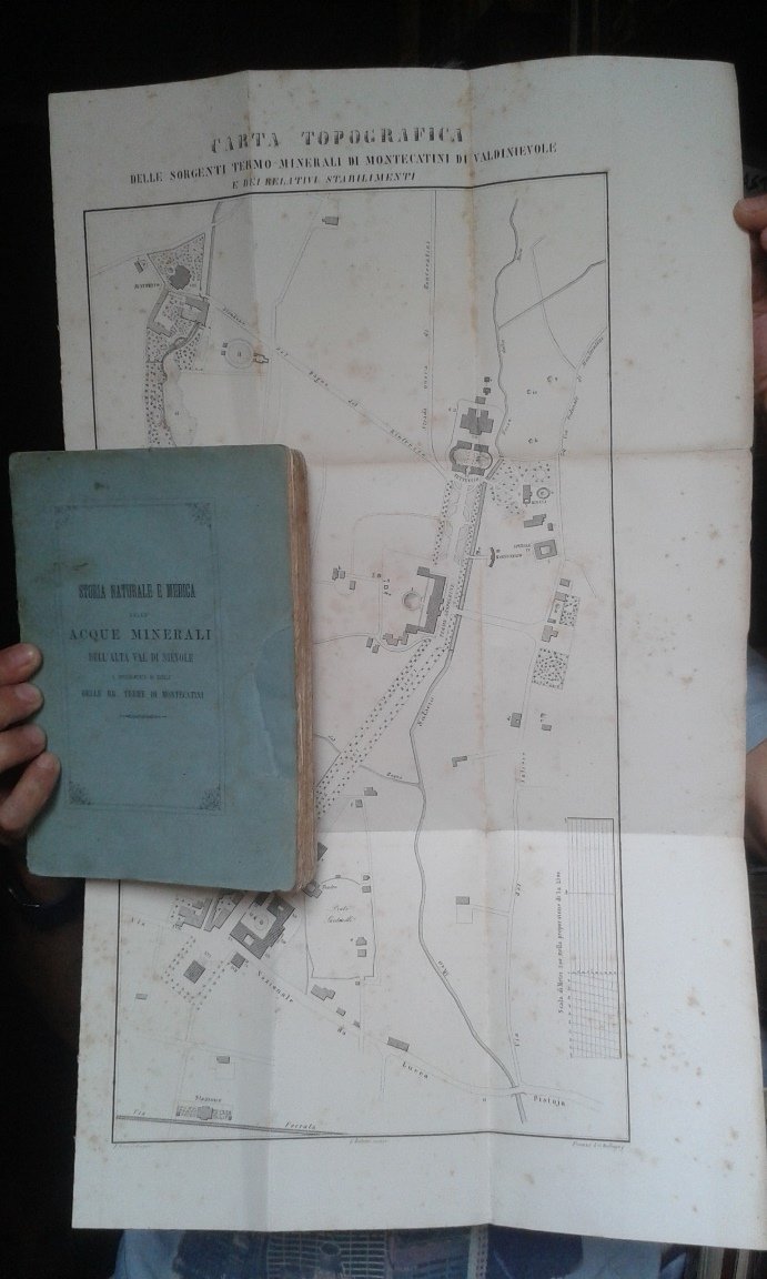 Volume in 8, brossura editoriale, titolo al piatto inquadrato ed al dorso, sguardie, frontespizio, XV, 333 pp., grande carta topografica pi volye ripiegata, vedutine come iniziali di capitolo. Eccellente resoconto sulle varie sorgenti termali dell'alta Val di Nievole con un approfondimento sulle Reali Terme di Montecatini. Sono analizzate non solo le propriet organolettiche e curative delle fonti termali, peraltro riportata un'ampia narrazione storica e di contesto sociale. Importante ed assolutamente poco comune, il tomo in pi che bello stato (piccolo restauro alla brossura anteriore). Notevole.