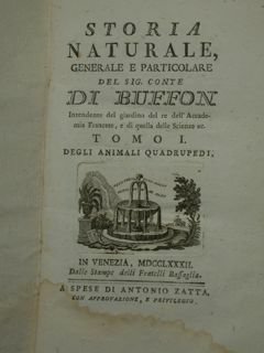 STORIA NATURALE generale e particolare del sig. conte DI BUFFON intendente del giardino del re dell'Accademia Francese, e di quella delle scienze ec. Tomo I degli animali quadrupedi.