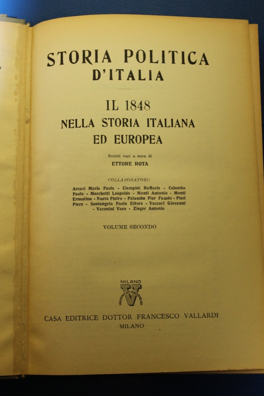 AA. VV. Storia politica d'Italia- il 1848. Milano, Vallardi ND italiano, 24,5 17 pp.1022 circa 2 Volumi, copertina in cartonato rigido rivestito in tela verde, immagini non presenti, pagine lievemente ingiallite, nel volume primo a pagina 35 e 38 macchie a lato di stampa, sguardia finale strappata nell'angolo inferiore. Volumi in ottimo stato
