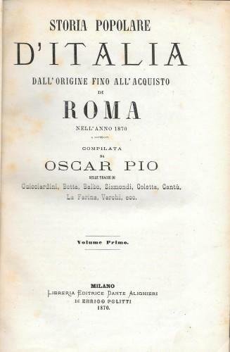 Storia popolare d'Italia dalla sua origine fino all'acquisto di Roma nell'anno 1870. Compilata da Oscar Pio sulle tracce di Guicciardini, Botta, balbo, Sismondi, Coletta, Cantu', La Farina, Varchi ecc., in 10 voll.