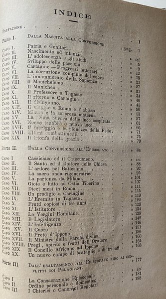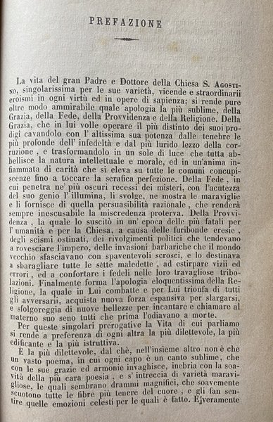 La vita del gran Padre e Dottore della Chiesa S. Agostino, singolarissima per le sue varietà, vicende e straordinarii eroismi in ogni virtù ed in opere di sapienza; si rende pure oltre modo ammirabile quale apologia la più sublime, della Grazia, della Fede, della Provvidenza e della Religione.