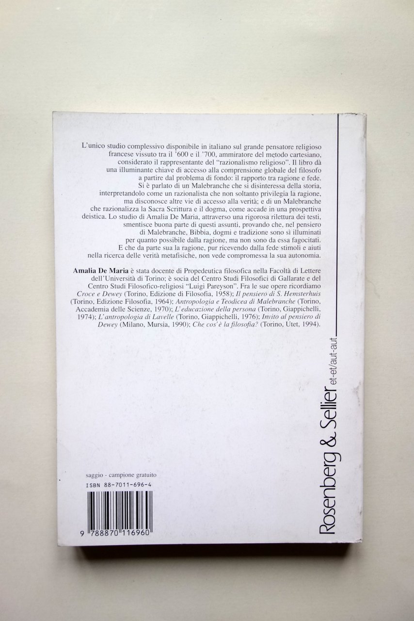 Amalia De Maria, Storia Sacra Scrittura e Tradizione nel pensiero di Malebranche Rosenberg & Sellier, Torino 1997; cm 21x15; pp. 256; brossura ed. Al frontespizio timbro di biblioteca, esemplare regolarmente annullato. Condizioni di conservazione Esemplare in ottime condizioni, pressoché mai sfogliato. Interni ottimi. SETT133.L21286 N