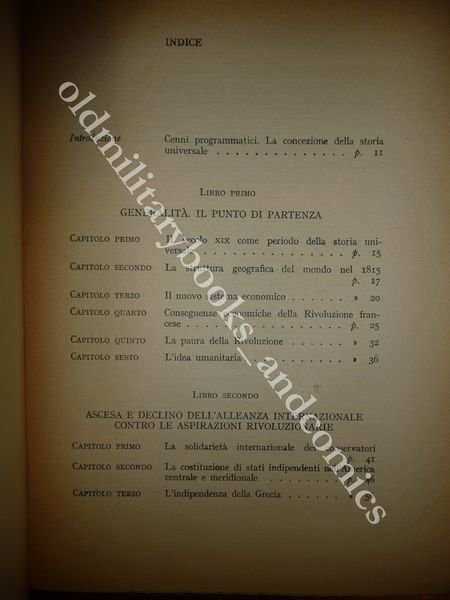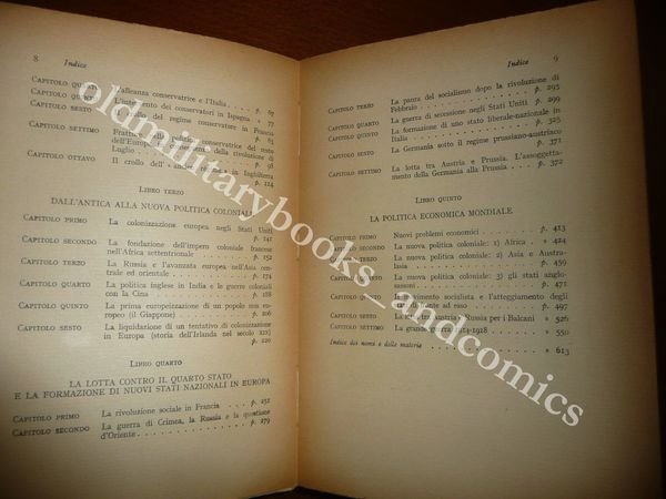 DESCRIZIONE: Einaudi Torino 1950 III^ Ediz., br. ed. pp. 643. Libro I: Generalità: il punto di partenza (Il sec.XIX come periodo di storia universale; Struttura geografica del mondo; Nuovo sistema economico; Conseguenze economiche della rivoluzione francese; Panico di fronte alla rivoluzione; L'idea unitaria) - L.II: Ascesa e declino dell'alleanza internazionale contro le aspirazioni rivoluzionarie - L.III: Dall'antica alla nuova politica coloniale - Libro IV: Lotta contro il quarto stato e formazione di nuovi stati nazionali in Europa (Rivoluzione sociale in Francia; Russia e questione d'Oriente; Paura del socialismo dopo la rivoluzione di febbraio; Guerra di secessione negli USA;Formazione di uno stato liberal - nazionale in Italia;Germania sotto il regime prussiano - austriaco; Lotta Austria - Prussia) - Libro V: Politica economica mondiale (Nuovi problemi economici; Nuova politica coloniale; Movimento socialista; Lotta Austria - Russia per i Balcani; Grande guerra). CONDIZIONI: Ottime/Perfette, presente una dedica all'antiporta. PESO / WEIGHT: 943 gr. without package