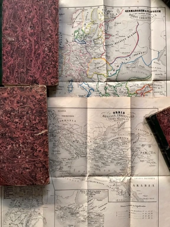 5 volumi in 4 tomi in-8° (cm. 22,3), legatura coeva in mezza pelle verde con titolo in oro ai dorsi (lievi tracce d'usura), tagli spruzzati, carte in buono stato con 2 carte geografiche in litografia ripiegate f.t. in fine a due tomi (Impero romano al tempo degli apostoli e Regni germani e slavi nel Medioevo); una leggera brunitura uniforme e sporadiche fioriture. Buon esemplare.