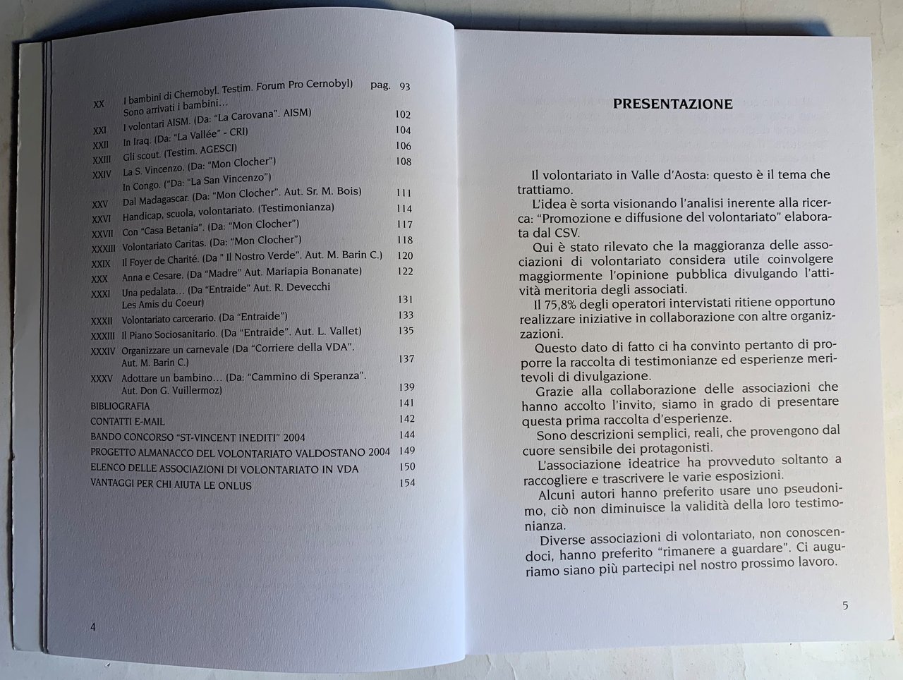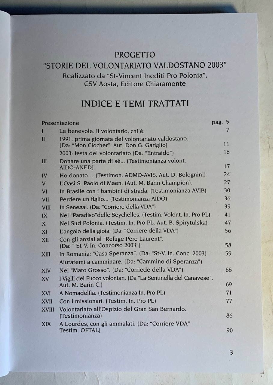 I ed.: Aprile 2004. Volume a cura del Comune di St-Vincent Assessorato Istruzione e Cultura - Centro di Servizio per il Volontariato Valle d'Aosta/ Centre de Service pour le Bénévolat Vallée d'Aoste ONLUS. Collana St-Vincent Inediti - ONLUS. VIII/ pp. (2)+156=158+(4: 88-91)=162/ brossura in cartoncino patinato bianco con grafica in nero, rosso e turchese e con illustrazioni fotografiche a colori e in b/n ai piatti. Con illustrazioni in b/n nel testo e f.t.. Stato buono (lieve usura della copertina - copertina e pagine lievemente brunite - al fondo del volume sono rilegate altre quattro pagine più ampie fuori numerazione di un capitolo XX "Sport e volontariato" con pagine numerate 88-91. Il capitolo non è indicizzato).
