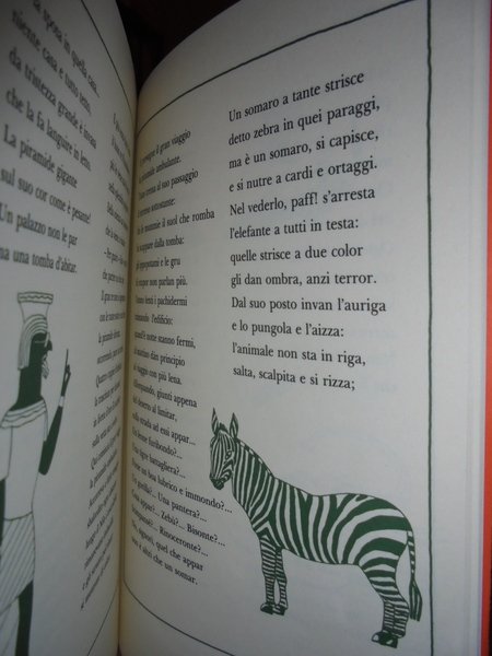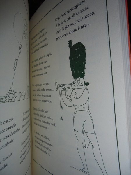TOFANO, Sergio. - Milano, Adelphi 2001. In-8° piccolo, cartoncino edit., 112, (6) pp. con numerose illustrazioni a colori nel testo. alle imprese di Cecco, eroe con le orecchie turate, a quelle mirabolanti di Guerino («ma se il fatto è noto a tutti, raccontarvelo – perché?»), dalle angosce dell’esploratore Pippo Pótamo che non sa che cosa esplorare a quelle di Barbablù che cerca invano moglie: altre storie incongrue, ariose, impertinenti, che si inanellano con quelle dei Cavoli a merenda, ma usando questa volta una forma versificata, trattata con mano felice, da virtuoso della filastrocca. E l’illustratore Sto qui sfrena il suo estro, inventando un libro di sorprendente novità grafica (siamo nel 1920).