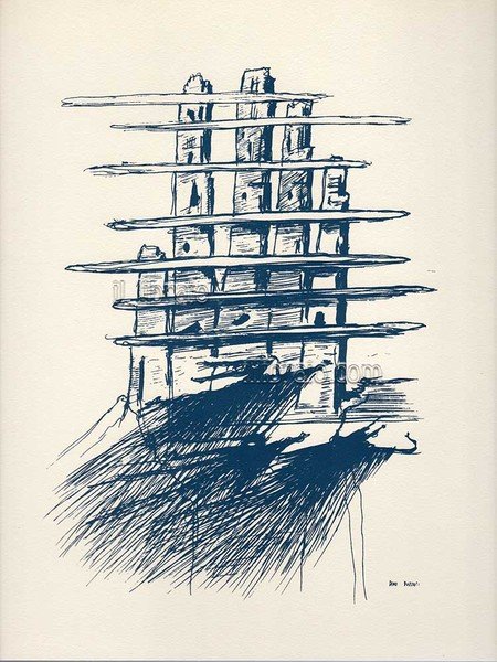 in 4°; pp. 58 + 1 tav. (ill. in bn. e col.); br. con sovracop. Edizione della prima esposizione di Dino Buzzati "pittore" tenutasi a Milano, presso la Galleria dei Re Magi. Stampato su carta a mano Rusticus della cartiera Miliani di Fabriano con tiratura di 1000 copie numerate. Allegata la riproduzione in facsimile della serigrafia preparata da Buzzati per la sua "personale"