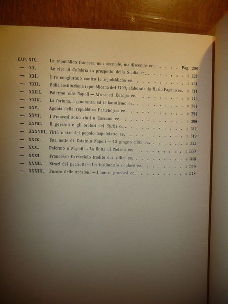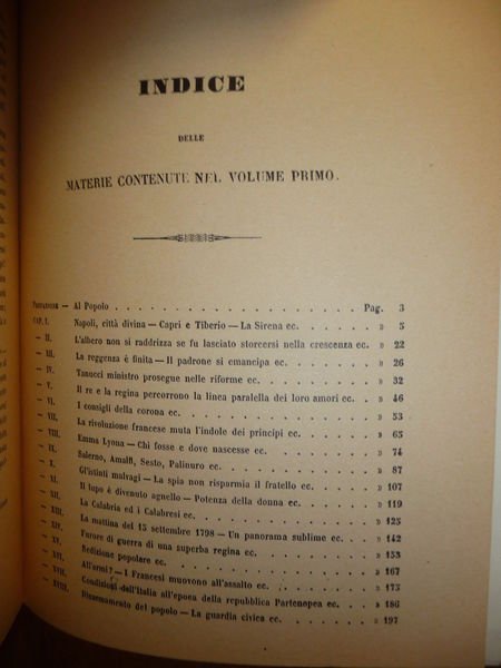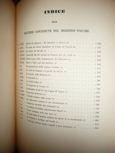 DESCRIZIONE: PRESSO SALVATORE DI MARZO - C.E.M. Palermo 1981, br. ed. ill. con alette pp. 823 complessive in 8° con numer. tavv. tratte da incisioni d'epoca. Ristampa anastatica dell'ediz. del 1860. Dall'indice: Capri e Tiberio; I re congiurarono con le repubbliche; Costituzione repubblicana del 1799 elaborata da Pagano; I carbonari; I partiti in Sicilia; Il congresso di Vienna; Il caso dei Bandiera. Indice completo in foto. CONDIZIONI: Buone/Ottime, voll. che presentano dei difetti alla parte alta del dorso, leggermente ingiallito, interni perfetti, ma SENZA COFANETTO. PESO / WEIGHT: 1938 gr. without package