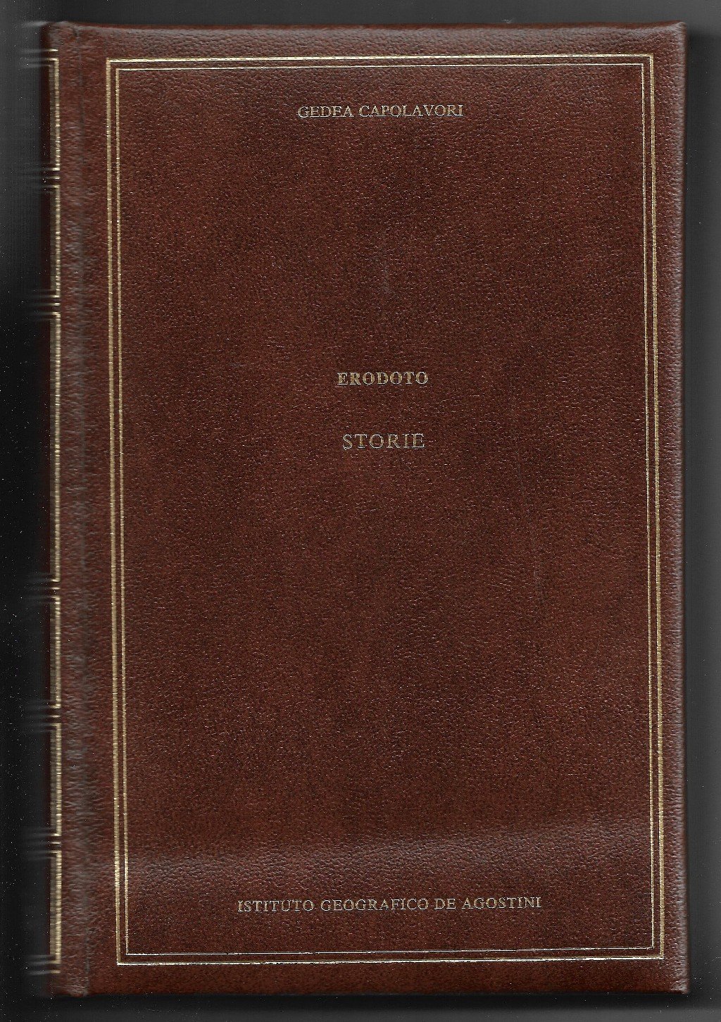Libro vintage. Argomento: Narrativa. Autore: Erodoto. Editore: De Agostini. Luogo: Novara. Anno: 2001. Formato: in-8°. Pagg: 577. Legatura: Cartonata in similpelle. Collana: Gedea Capolavori. Conservazione: Discreta. Traduzione di Renato Ferrari. Titolo impresso in oro al dorso entro cornice. Difetto di incollaggio tra il piatto e il dorso.