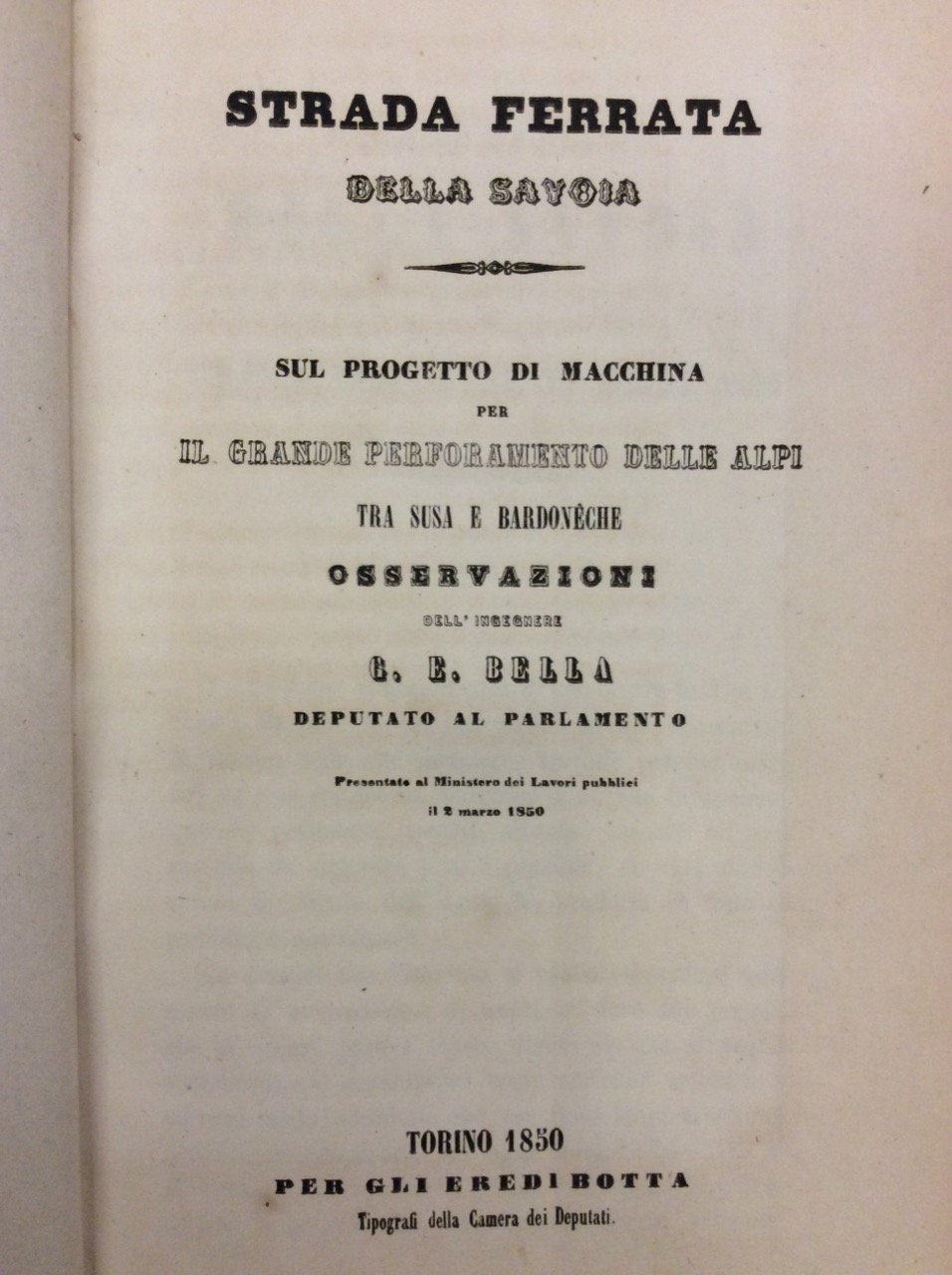 STRADA FERRATA DELLA SAVOIA - SUL PROGETTO DI MACCHINA PER IL GRANDE PERFORAMENTO DELLE ALPI TRA SUSA E BARDONECHE. - Osservazioni presentate al Ministero dei Lavori pubblici il 2 marzo 1850.