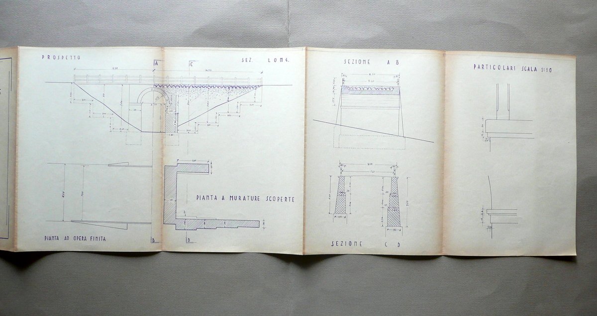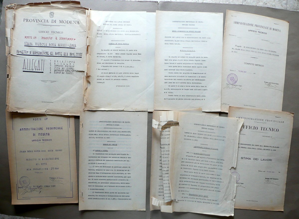 Progetto, Provincia di Modena Ufficio Tecnico Strada Vignola Bocca Ravari - Zocca Progetto di ricostruzione del ponte alla progressiva 29900 Allegati 1. Relazione 2. Disegni 3. Computo metrico 4. Stima dei lavori 5. Capitolato d'appalto 1947; progetto d'ingegneria civile (ricostruzione di ponte) costituito da ampio carteggio dattiloscritto (pp. non num.); presenza dei disegni a stampa del progetto in scala 1:100, su foglio rip. più volte (vedi foto). Presenza di firme e timbri che ne certificano la validità. Carteggio suddiviso per allegati, le cui pagine sono unite tra loro ad un margine est. mediante spillature. Gli allegati sono contenuti entro cartella con intestazione a stampa, e con titolo riportato a mano. Cm circa 34x25 (cartella); cm 30x104,5 (disegni aperti). Condizioni di conservazione Carteggio complessivamente ben conservato con tracce d'uso, qualche minima brunitura e lievissimi accenni d'ingiallimento dovuti al tipo di carta; cartella con alcuni strappetti, tracce di pieghette e poche piccole mancanze ai margini, angoli e dorso (alla parte sup. del dorso è presente uno strappo di alcuni cm, vedi foto). Allegati complessivamente in buono stato; dorso del verbale e prime quattro pagine dell'allegato capitolato speciale d'appalto" con strappetti anche di alcuni cm e qualche circoscritta mancanza, le quali non interessano il testo (vedi foto). Interessante e dettagliato progetto per la ricostruzione di un ponte della strada Vignola Bocca Ravari - Zocca, distrutto durante gli eventi bellici della seconda guerra mondiale. SC03.D11608 N "