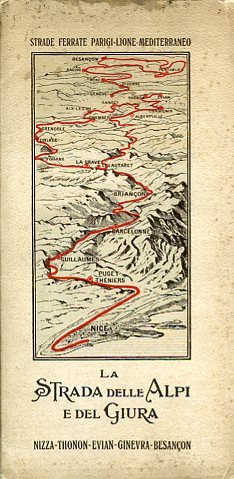 In-8° stretto, pp. 4 e una grande carta a due colori ripiegata a fisarmonca della strada delle Alpi e del Giura. Al verso della carta, numerose vedutine fotografiche e testo in italiano descrittivo dei 'grandi servizî d'auto-cars della strada delle Alpi e del Giura' con relativo itinerario turistico. Macchie ed aloni di lieve entità alla brossura, ma bell'esemplare.
