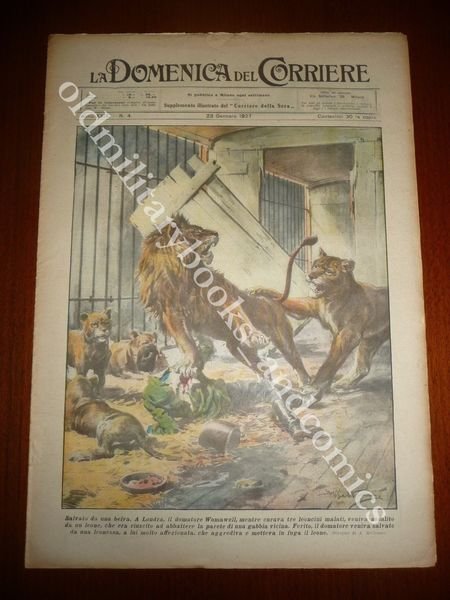 DESCRIZIONE: LA DOMENICA DEL CORRIERE 23 gennaio 1927 n. 4 In copertina: A Londra un domatore assalito da un leone, viene salvato da una leonessa. Al retro: La nuova strage degli innocenti. Durante l'icontro del cinematografo a Montreal (Canada): la tragica "valanga umana", sospinta dal pubblico, sulla scala di uscita della galleria. Come è noto, 77 ragazzi perirono. CONDIZIONI DELL'OGGETTO: Ottime senza sovracc. azzurrina, con pieghette. PESO/WEIGHT: 47 g without package