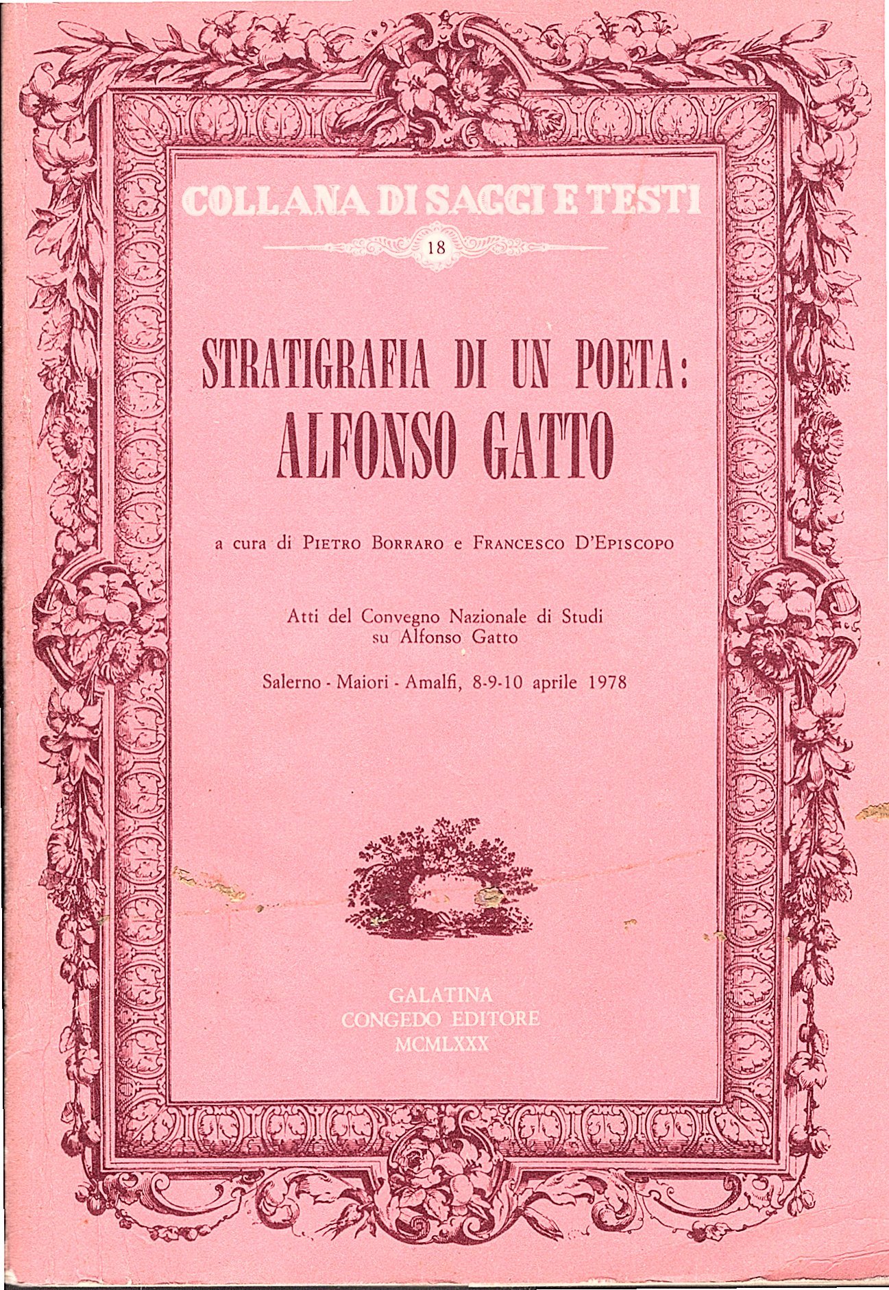 In-8° (21x13 cm), pp. 542 (2), brossura editoriale rosa antico a risvolti paratestuali, titoli in bianco e nero al dorso e al piatto anteriore entro cornice ornata. All' antiporta riproduzione a colori di ritratto del poeta di Carotenuto; tavole b/n f/t . Collana di saggi e testi, 18 (Sezione quarta: letteratura italiana, volume 3). Lievi segni d'uso del tempo alla brossura ma più che buon esemplare . Edizione originale di questi atti del Convegno Nazionale di Studi su Alfonso Gatto svoltosi Salerno - Maiori - Amalfi nel periodo 8-10 aprile 1978. Saggi di Piero Bigongiari, Oreste Macrì, Francesco D'Episcopo, Renato Aymone,et alii. Testimonianze di Mario Luzi, Vasco Pratolini, Alessandro Parronchi, Carlo Betocchi, Luigi Compagnone et alii.