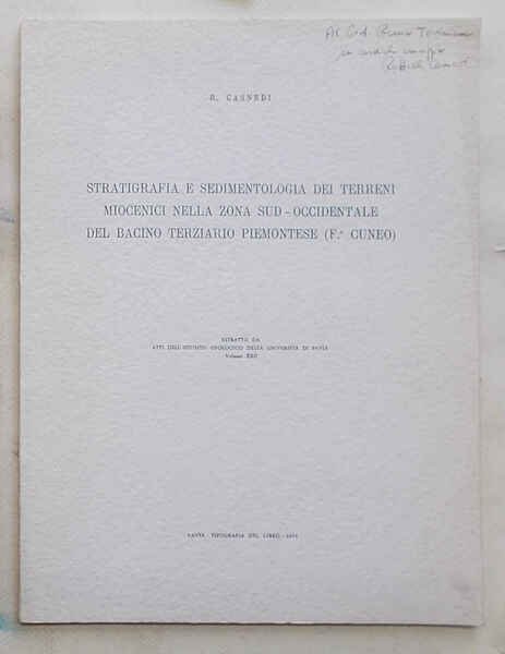 In 4° (cm. 28 x 21,5); pagg. 45; con 2 tavole fotograf. e 22 figure n.t.; leggera cartonatura origin. VG. ** Con invio autografo dell'Autore. Tratta delle formazioni e marne di S. Paolo, Monesiglio, Paroldo, Bastia Mondovì, Murazzano, Lequio, S.Agata Fossili. Estratto da Atti dell'I. Geologico Università Pavia.