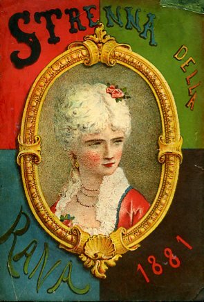In-8°, pp. 129, bella brossura editoriale figurata a colori. Al piatto anteriore, ritratto di una dama elegantemente acconciata e vestita entro cornice, mentre, a quello posteriore, spicca la figura dell'anfibio da cui l'almanacco prende il nome. Frontespizio in rosso e in nero con figura di una rana che suona una chitarra; testo entro filetto tipografico. Numerosissime illustrazioni a carattere umoristico e caricaturale incise in litografia n.t. o a pag. intera; le pp. 59-66 presentano sia il testo che le illustrazioni impresse monocromamente in rosso. Minimi restauri al dorso, usuali bruniture e fioriture interne, ma bell'esemplare. Curiosissima strenna bolognese adunante scritti in prosa e in versi di vari autori, tutti anonimi o pseudonimi e a carattere eminentemente umoristico. Fra i contributi: Il romanzo d'uno spiantato; Il Prete Cuoco; La Deplomazia femminile illustrata da Serafino; Non più inganni ovvero l'arte di conoscere maschi e femmine dai tratti del volto (trattato di negromanzia estetica di Lavater e Gall attaccati assieme); Qua e là per Bologna; Elisir di lunga vita (lavoro di Dulcamara); Minestrone illustrato (grande rivista comica del penzolante anno 1880). Le litografie e il testo de La Deplomazia femminile (pp. 42-50) sono impresse in tinta sanguigna. Assai singolare il trattatello di fisiognomica sopra citato, che occupa le pp. 59-66, mentre 'Qua e là per Bologna' ha frontespizio autonomo ed è detto scritto 'dal Cronista della Rana'.