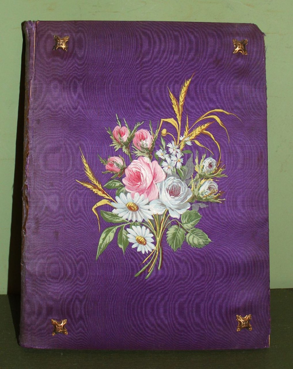 In 8° grande (cm. 26 x 20), pp. 193. Leg. editoriale in seta viola. Sul primo piatto l'immagine di un mazzo di fiori a colori. Dorso con titoli e fregi romantici oro. Borchie decorative in ottone agli angoli di entrambi i piatti. Dorso scolorito con qualche piccolo difetto (la seta nella parte alta della prima cerniera è aperta). Tagli dorati. Copia in buono stato. Frontespizio figurato e quattro tavole fuori testo in cromolitografia. Testi di Capranica, Giovagnoli, Sartorio, Bonturini, Corbellini, Bolaffi, Sacchetti, De Castro.